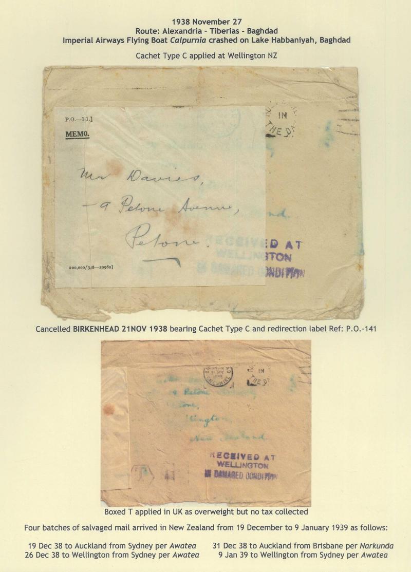 four fatalities, Brian Peace's exhibit pages, including underpaid cover with manuscript "Received in damaged/condition ex flying boat Calpurnia, cachets 'RECEIVED IN DAMAGED CONDITION/EX FLYING BOAT CALPURNIA' in violet x7 (three registered, and one