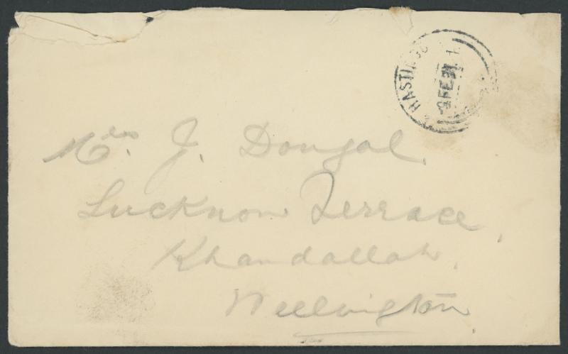 1931 (Feb 9) unstamped social cover to "Khandallah/Wellington" with 'HASTINGS' cds, opened a little roughly & a bit soiled.