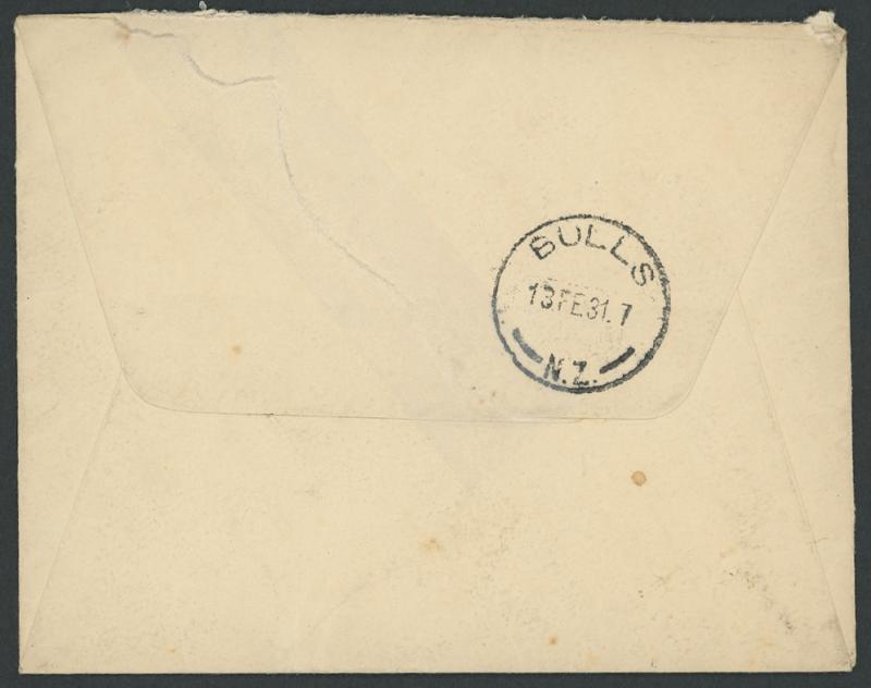 cds, repaired opening tear across the flap. Mail from Napier was flown from Hastings only between 5.2 & 9.2.1931. Bulls is more than 200km by road south-west of Napier and this cover probably travelled by road, such items being much scarcer than