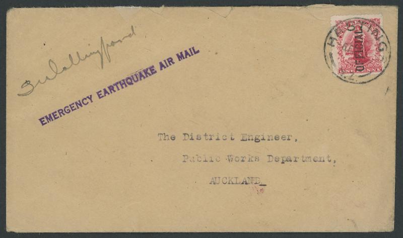 1931 (Feb 6) plain cover with 1d 'OFFICIAL' tied by 'HASTINGS' cds, to "Public Works Department/Auckland" with superb 'EMERGENCY