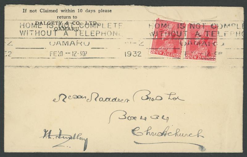 1932 (Feb 19-20) commercial covers from Dunedin x2, 'OAMARU' (telephone slogan cancel) or 'RANFURLY' all to Christchurch, one with