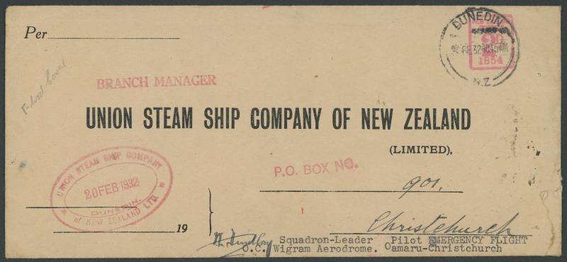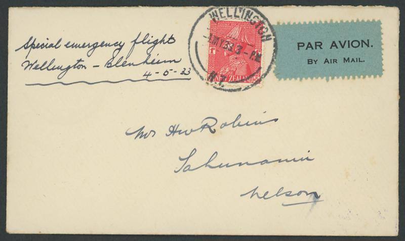 flight of the same day with 1d Field Marshal. A shipping strike had interrupted the Cook Strait mail service & Willis offered to assist but carried only very small mails.