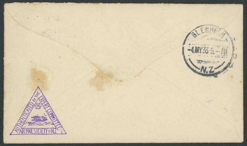 1933 (May 4) appropriately endorsed covers flown by AE Willis 'BLENHEIM' to Wellington (backstamp, being a 1d Envelope), and return