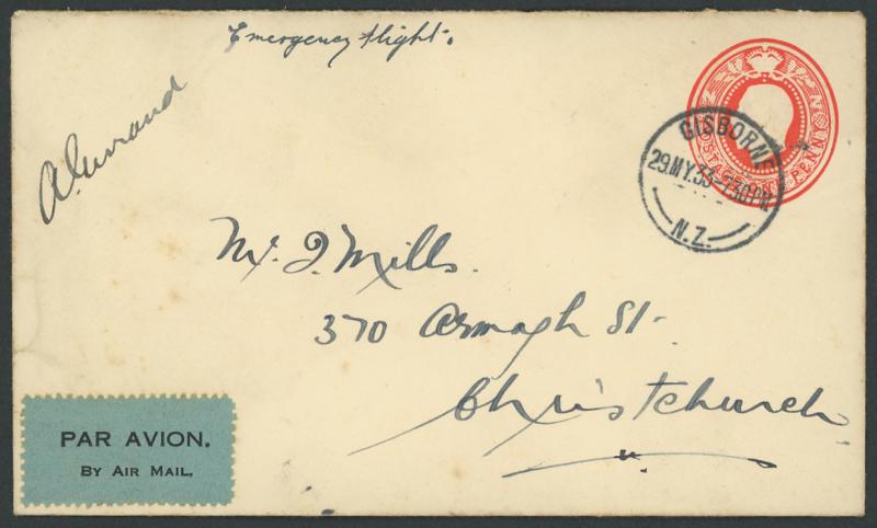 1933 (May 29-30) cover & 1d Envelope (light spotting) both endorsed "Emergency Flight", Hastings-Gisborne & the return flight & on