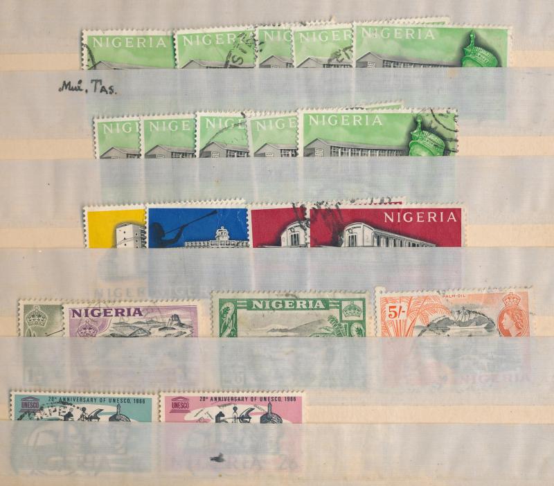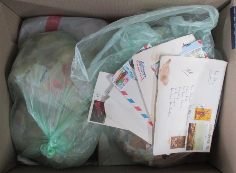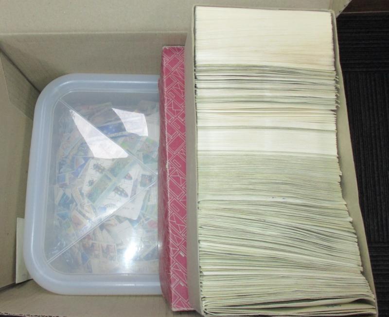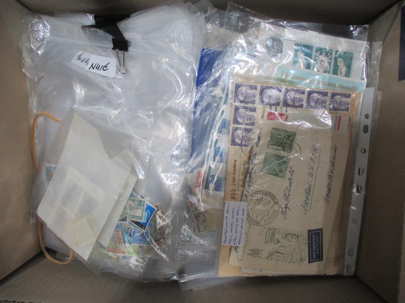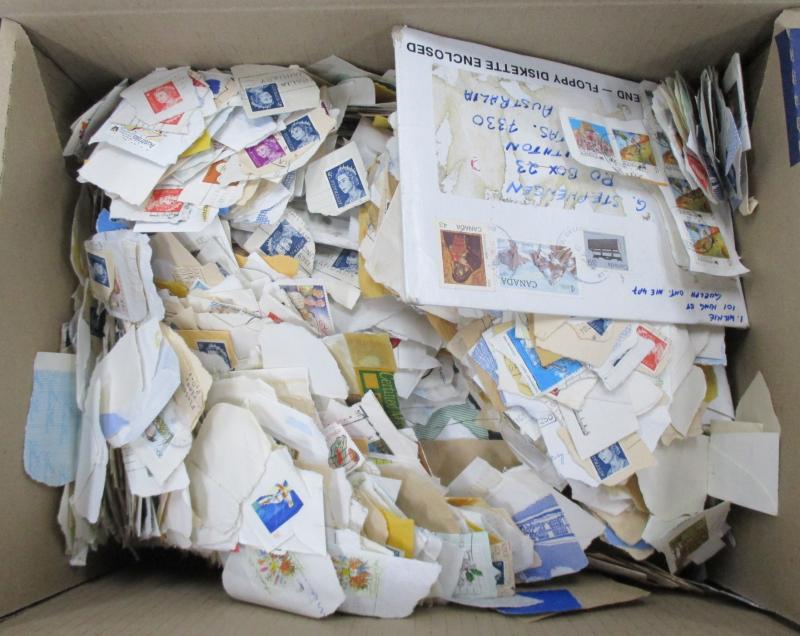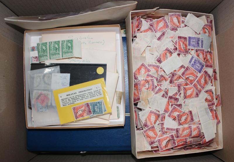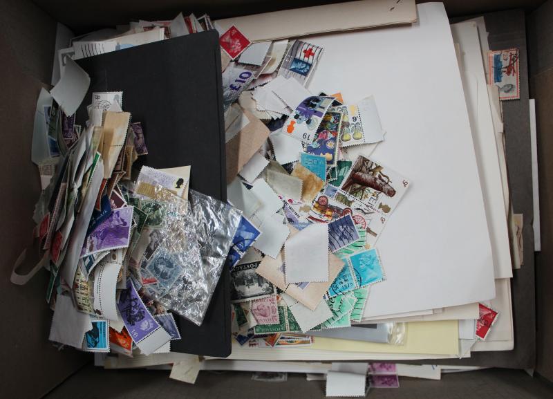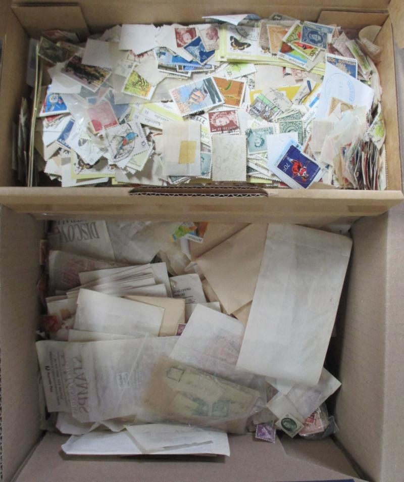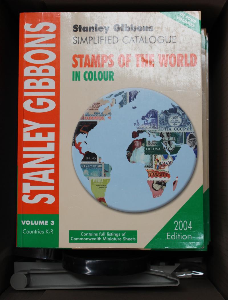 used plus a few covers and a Gibbons 'Stamps of the World' 2004 catalogue in four volumes in good condition, huge quantity including one entire box full of envelopes sorted by country. Weighs 80kg.