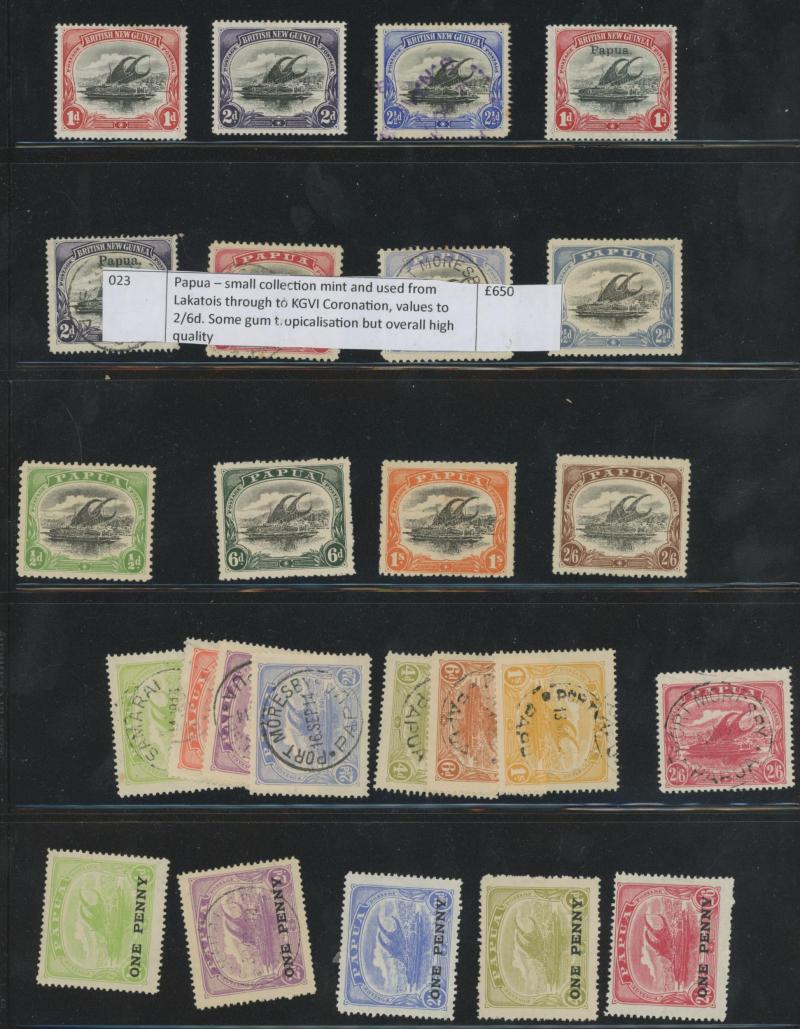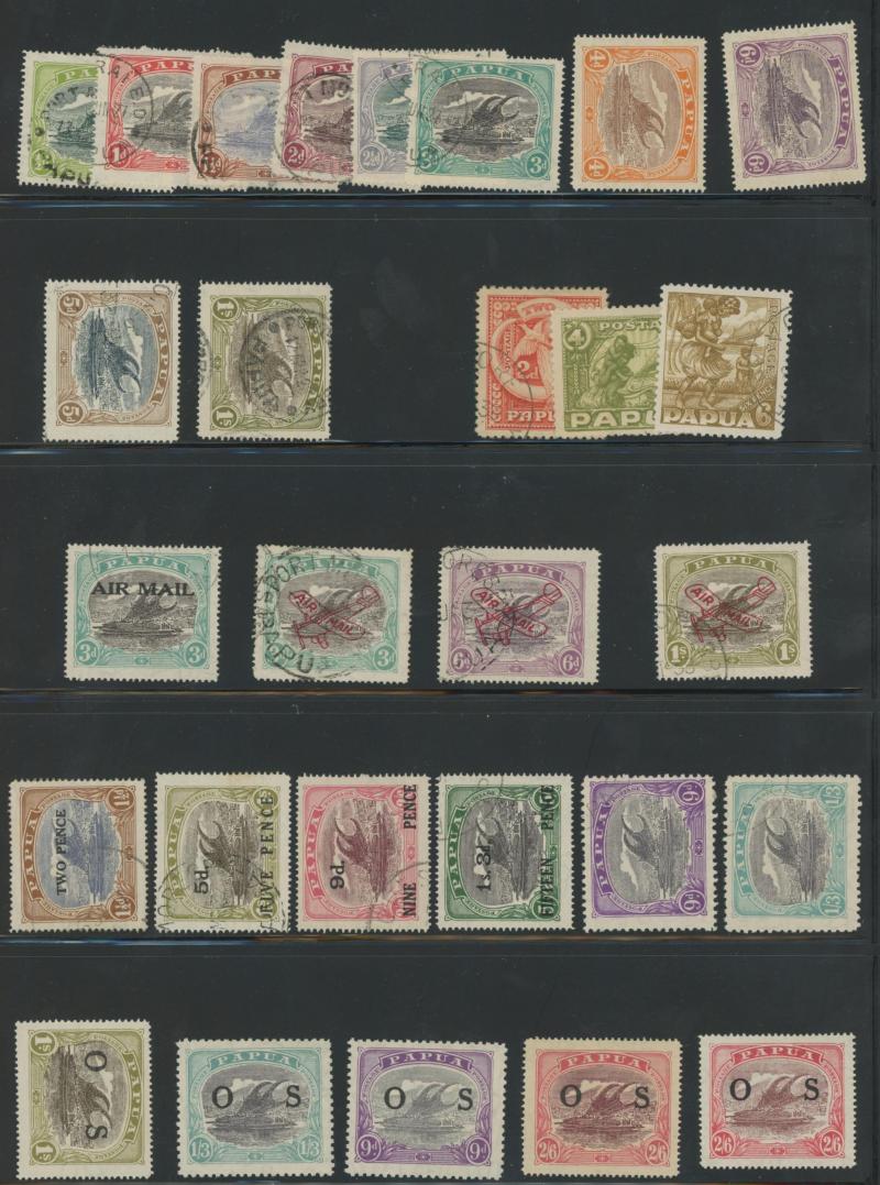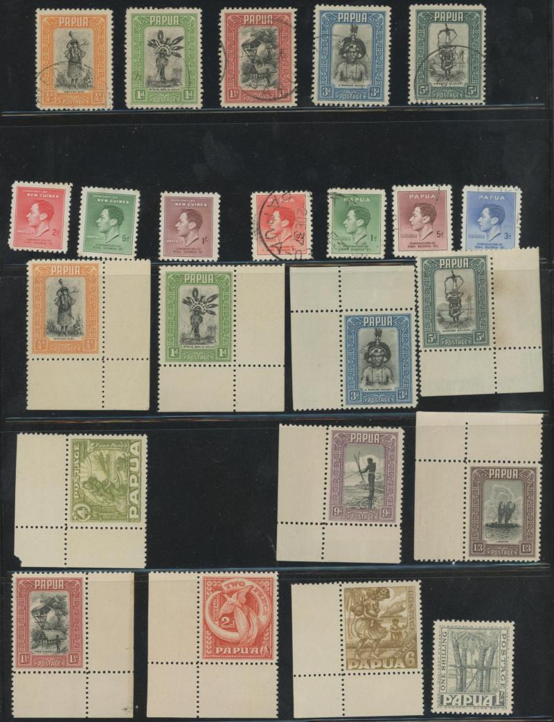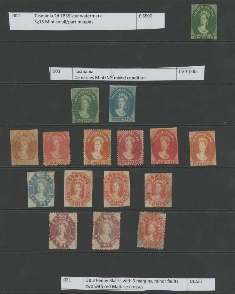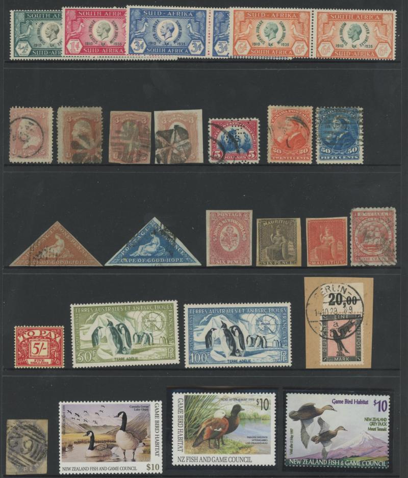 standard with some Tasmanian Chalons that may be unused, three pages of mint Papua, GB 'Penny Black' three presentable spacefillers, French Antarctica Penguins 50fr & 100fr very lightly mounted, Cape Triangles 1d & 4d, South Africa 1935 Jubilee