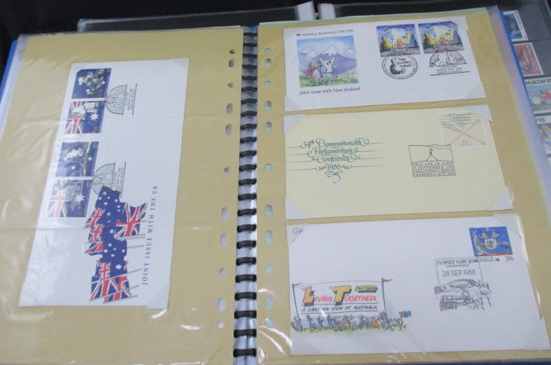Bicentennial Collection, Flowers, Animals, Flags, Birds x2 etc, Pacfic Islands issues from the 1980s, Ausipex 1984 Album, QEII British Commonwealth on stockcards, also 1977 QEII Silver Jubilee FDC collection, USA 1970s-80s FDCs including State Flags