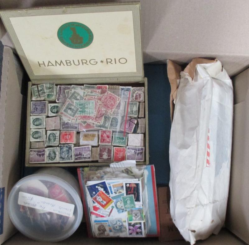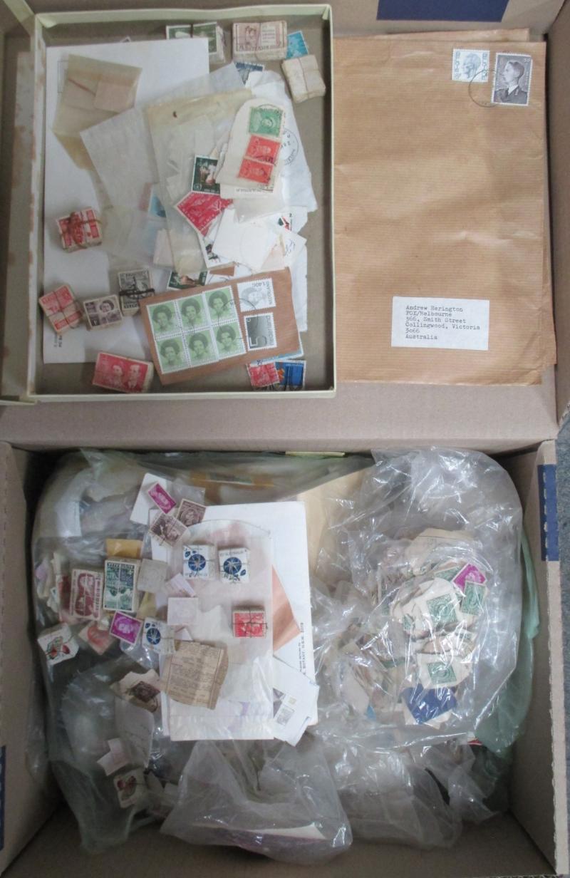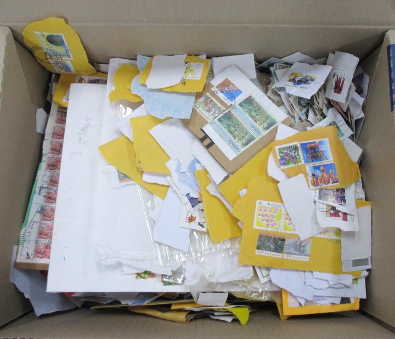 Worldwide stamps in albums filling three cartons on- & off-piece in envelopes by country, parcel piece with Australia Arms £2 x3 £1