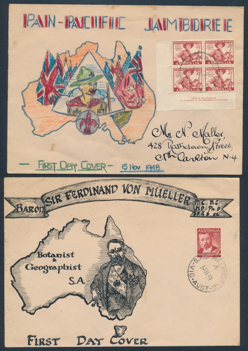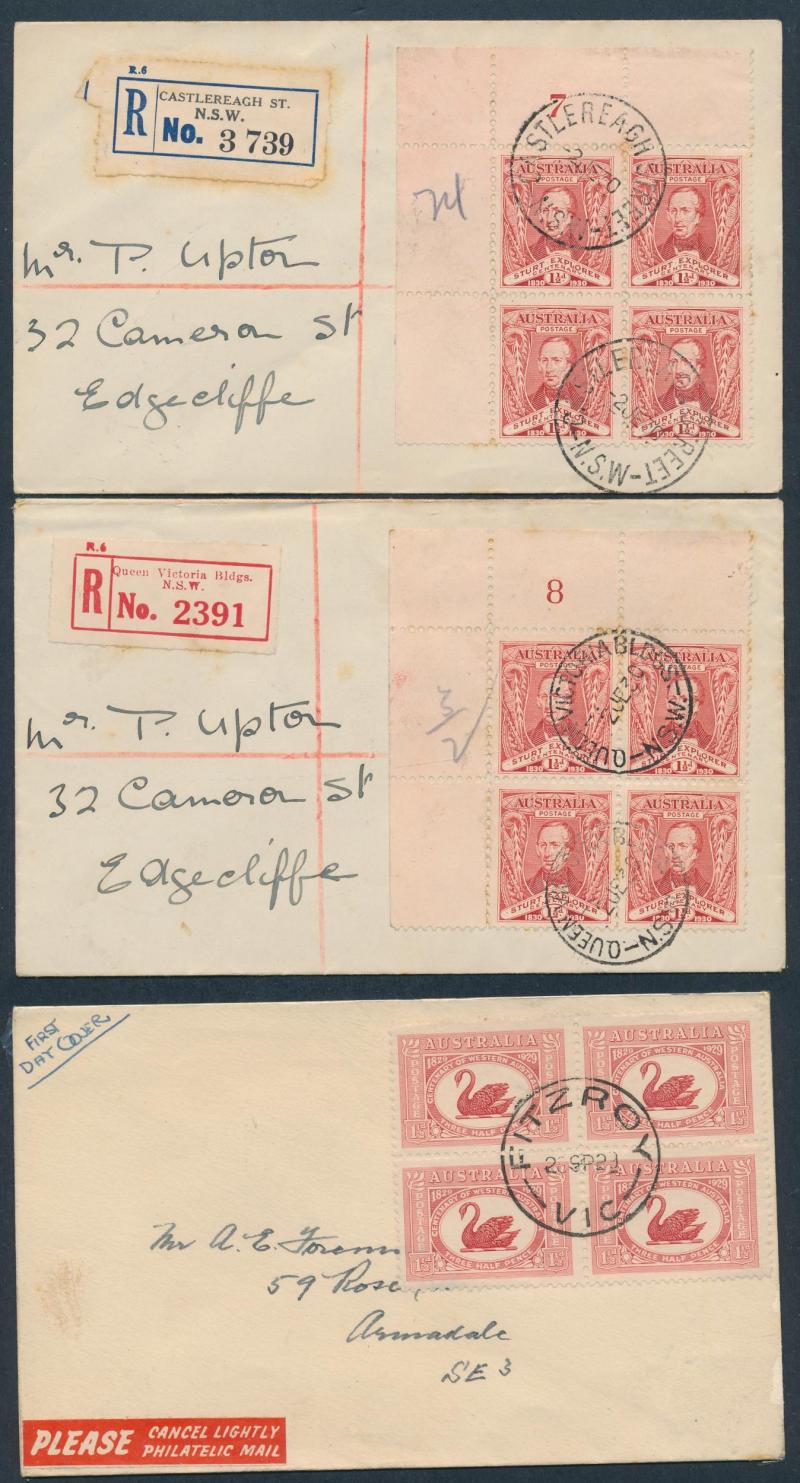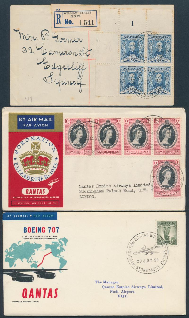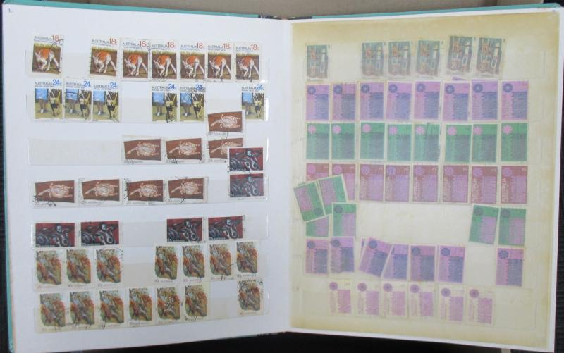 collections plus unsorted on and off paper, then a large number of Australian Decimal FDCs & PSEs in sticky photo albums plus an interesting range of early Australian FDCs including Sturt Plate Number blocks of 4 set and hand-illustrated FDCs Baron