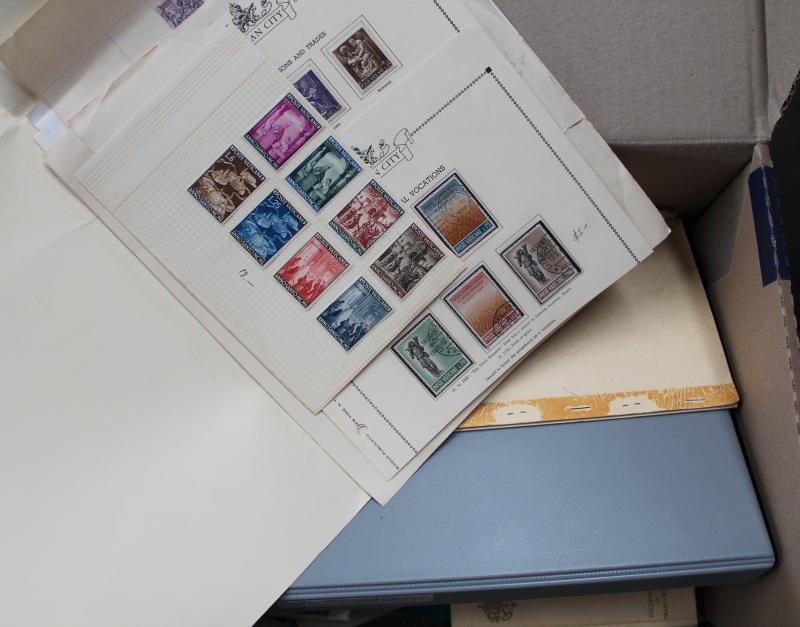 catalogues, modern postcards, empty VST and Schaubek stockbooks also coins, mixed condition. Weighs 51kg. Proceeds to Legacy.