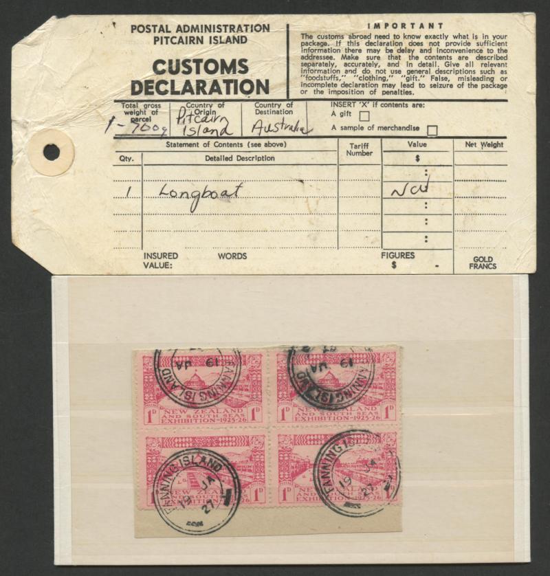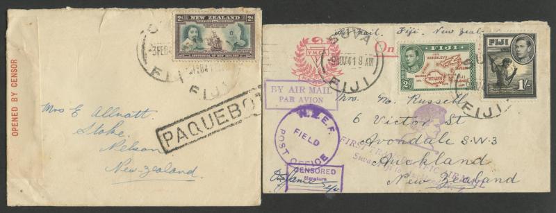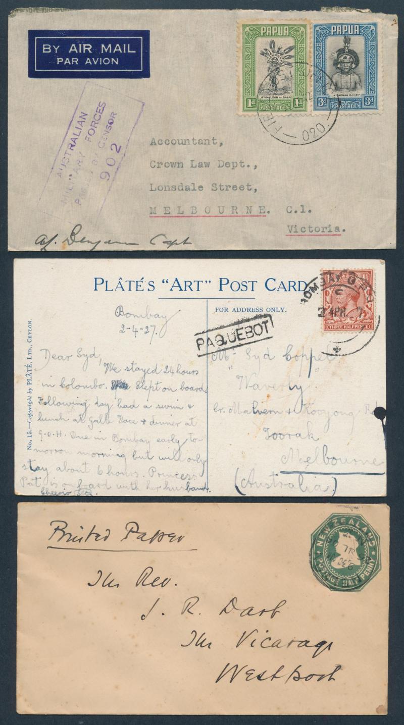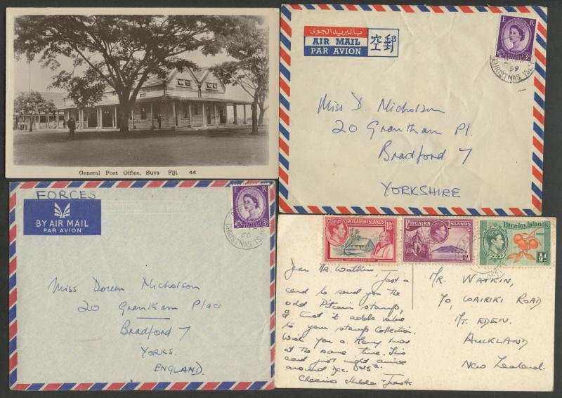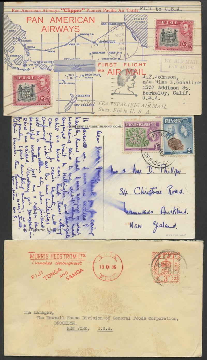 Mission with large 'BARAKOMA AIRFIELD' cachet, three different ship PPCs from Pitcairn to NZ with full social messages & parcel tag with printed Pitcairn Customs Declaration, Fiji 1941 paquebot cover from NZ with 'Passed by Censor/..........' cachet