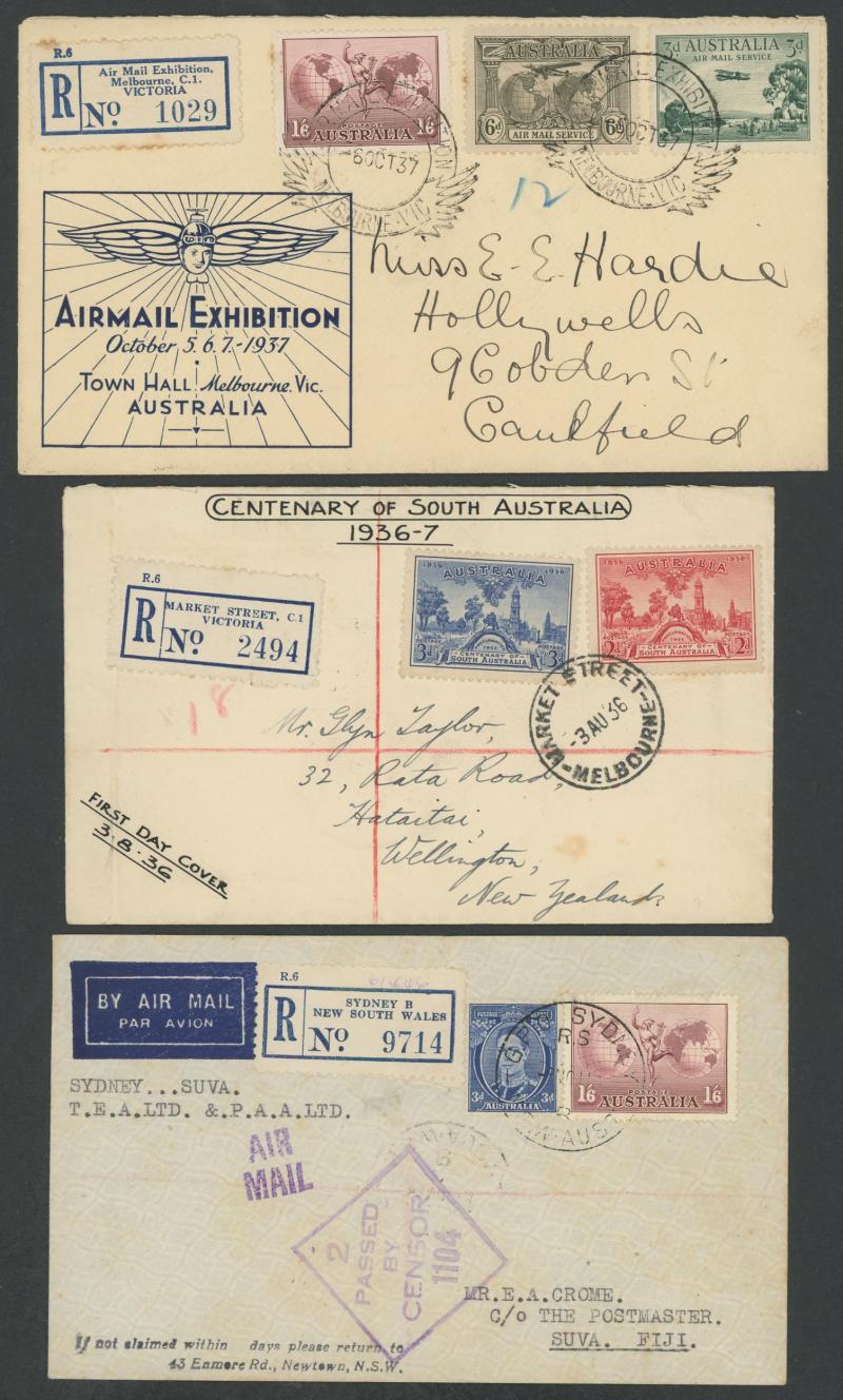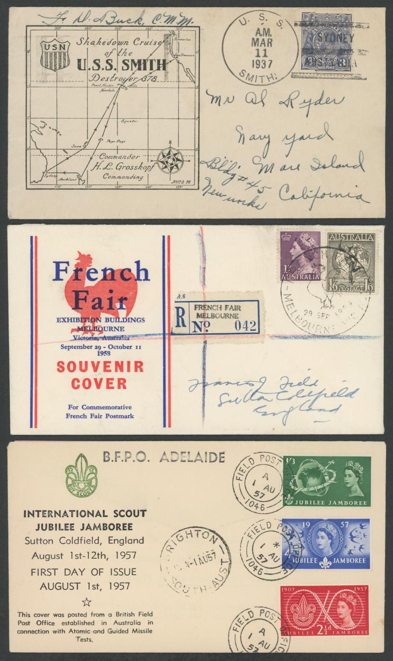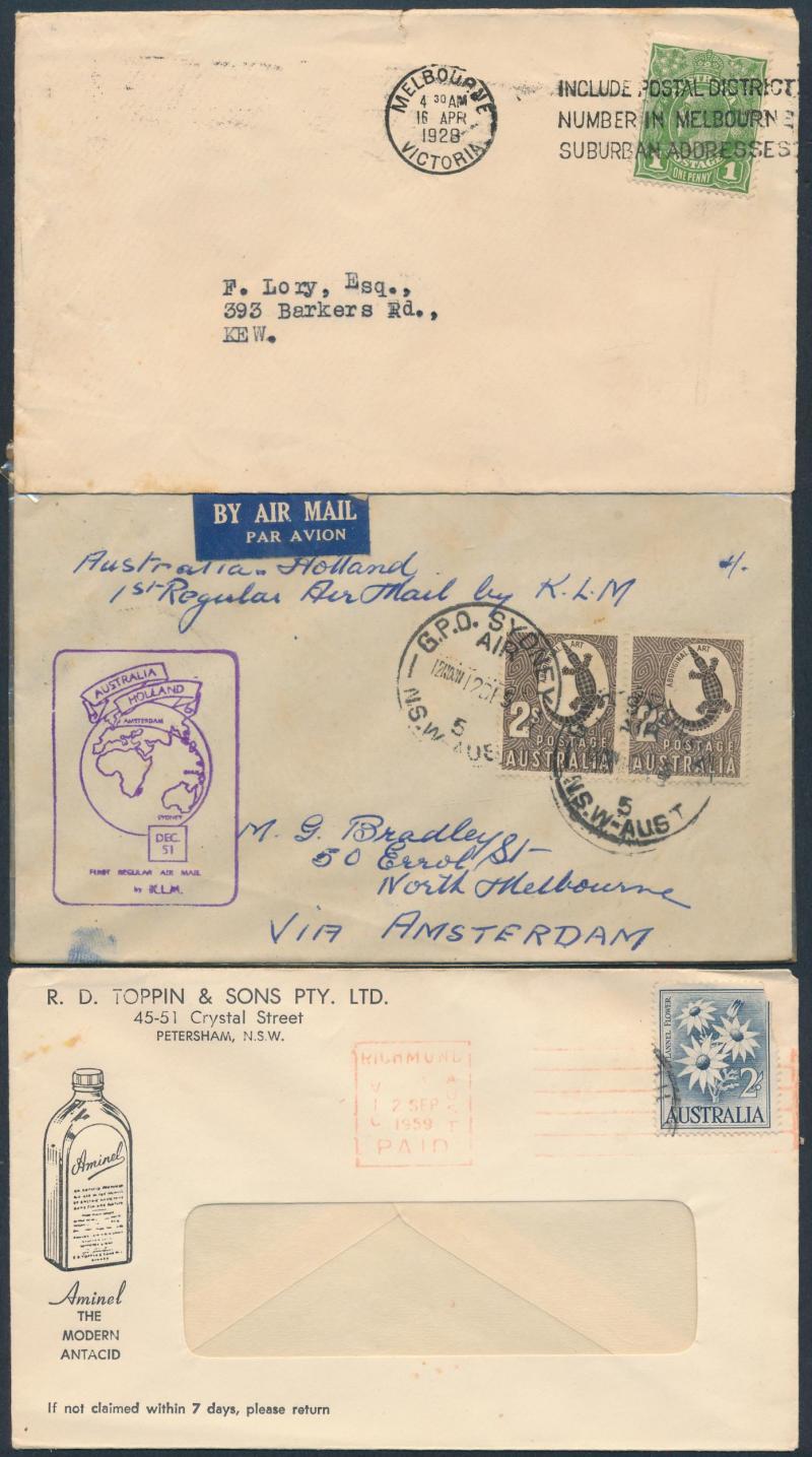COVERS: Large box full of items from Australia including a few with commemorative cancels & provisional R labels and some flights;