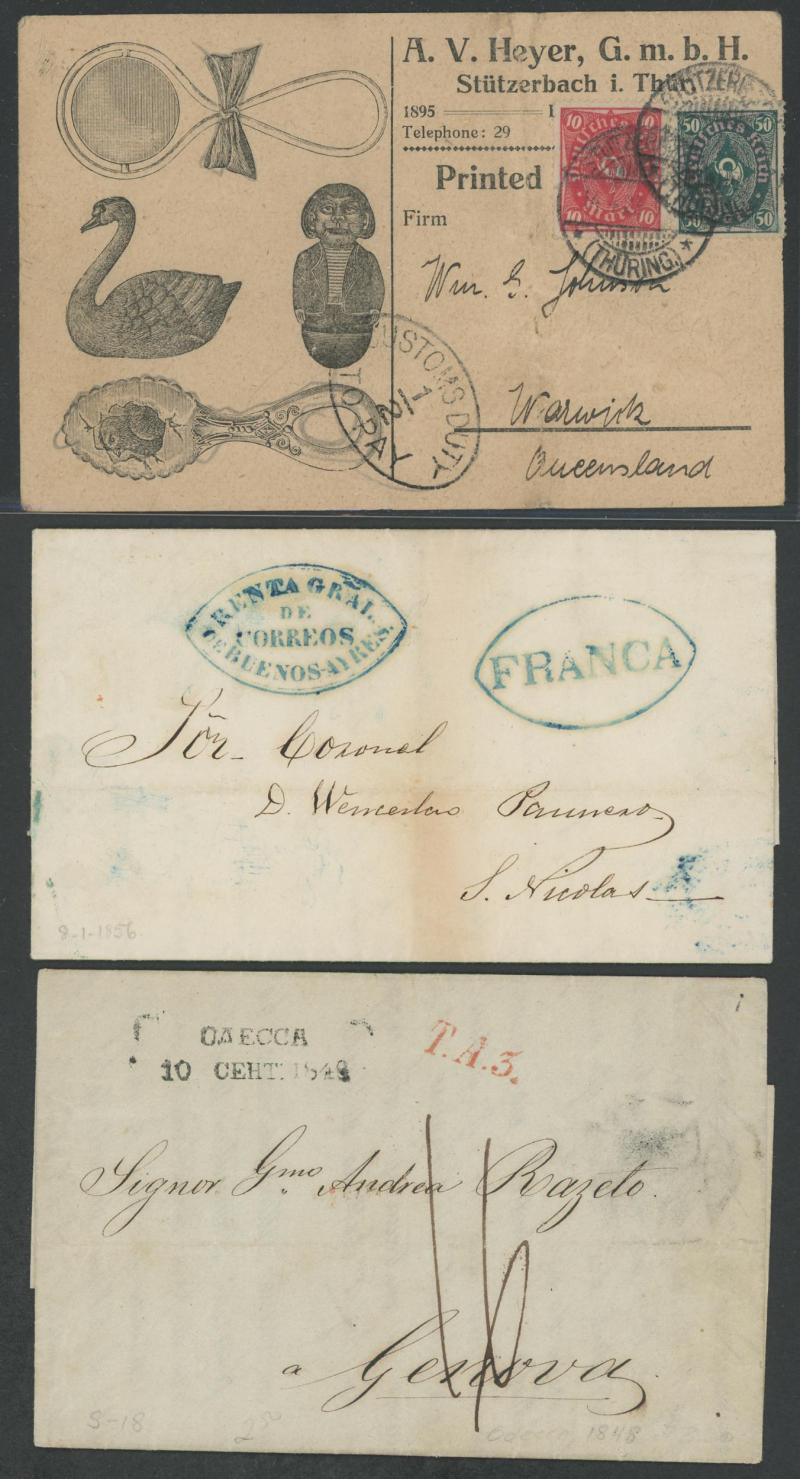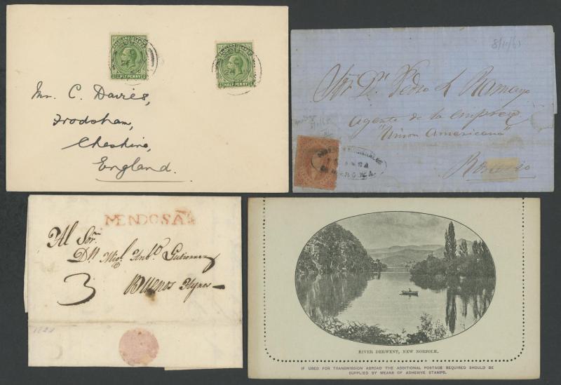 a good variety of frankings; Russia 1848 very fine entire with 2-line Odessa datestamp; Argentina early covers including 1856 stampless with 'SRENTA GRAL/DE/CORREOS/DE BUENOS-AYRES' "lemon" in blue; etc, also a bundle of Picture Postcards from Ceylon