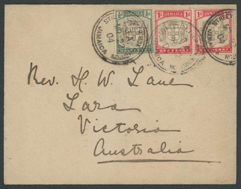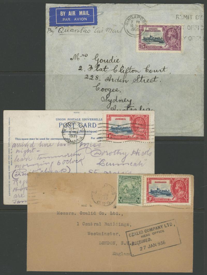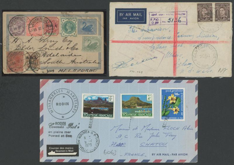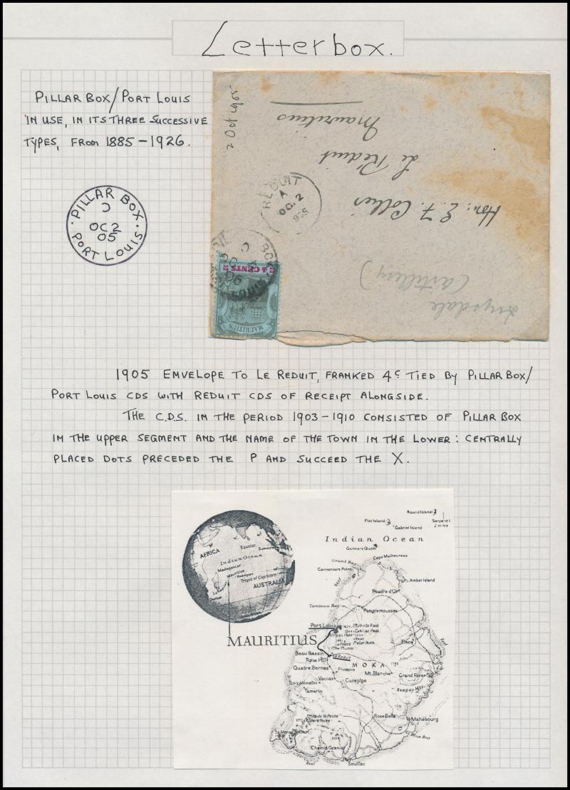 Australia & Britain, includes 1904 cover to Australia with very fine 'STREET LETTER BOX KINGSTON/ 3A /JAMAICA' cds and 1905 stained Mauritius local cover with 'PILLAR BOX/PORT LOUIS' cds & 'REDUIT' arrival cds, generally very fine. Ex George Speirs.