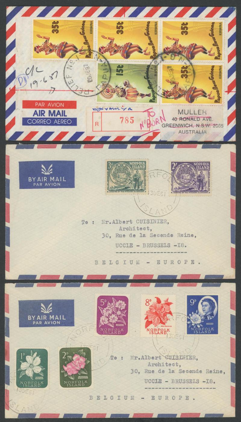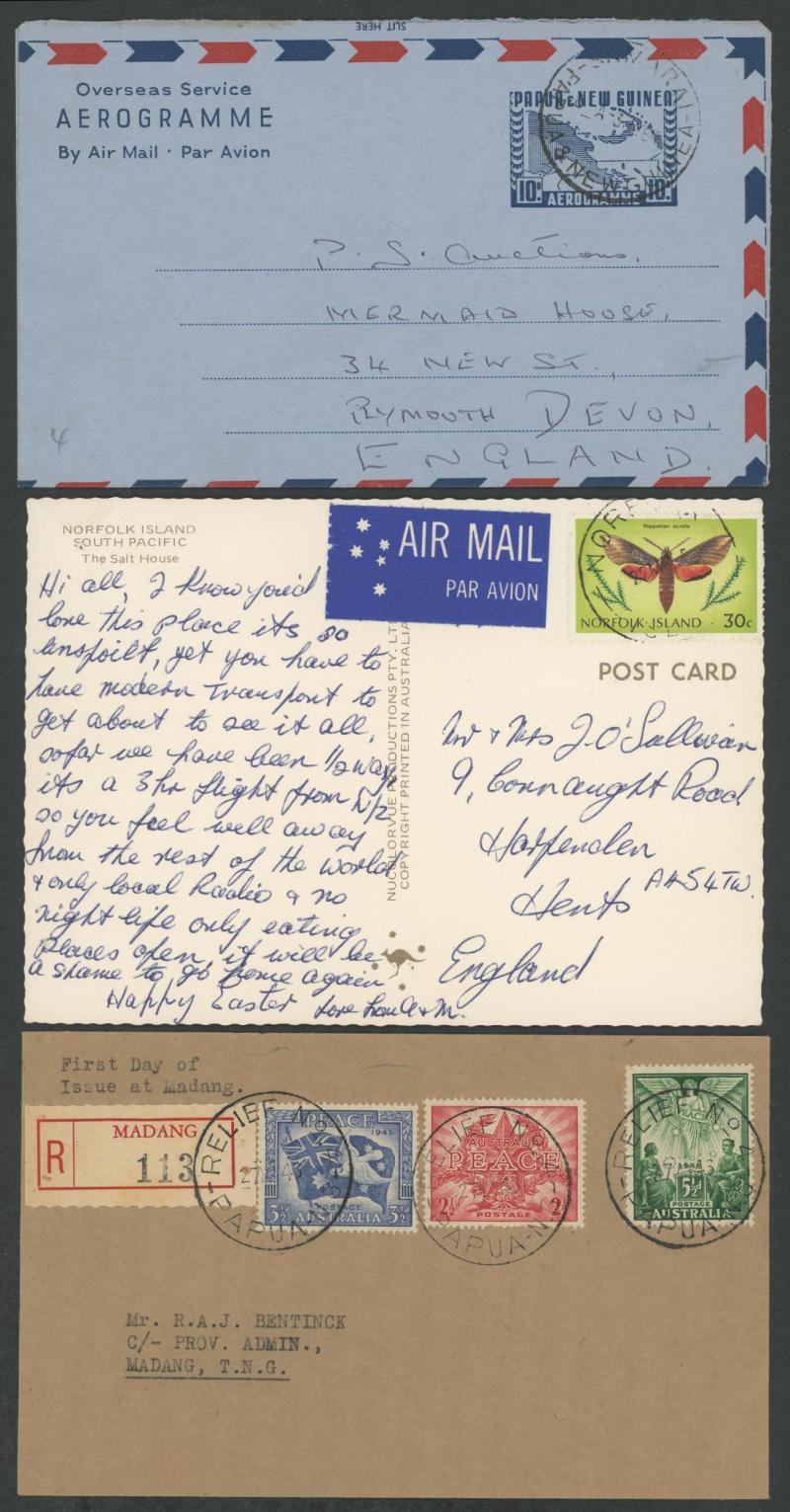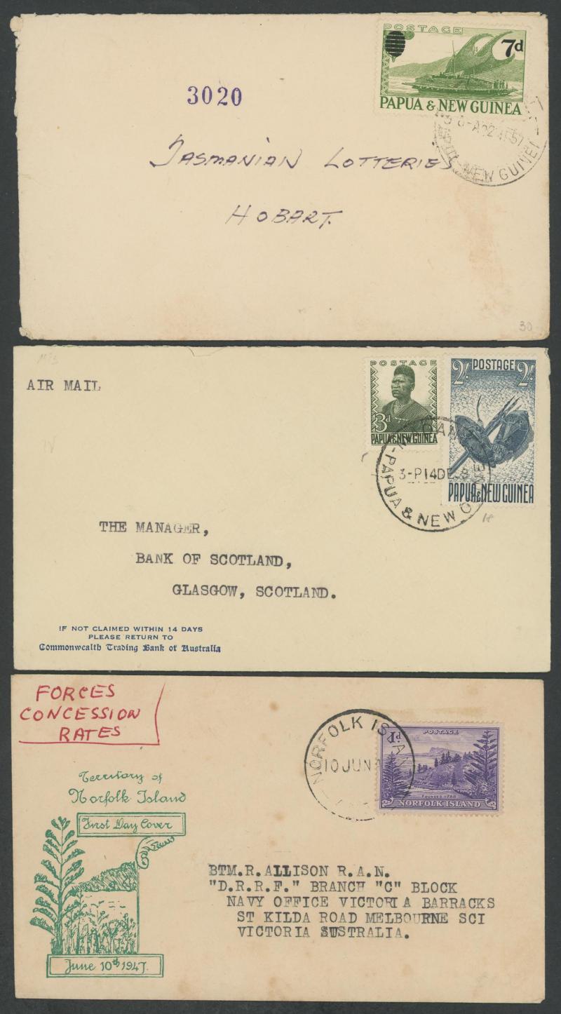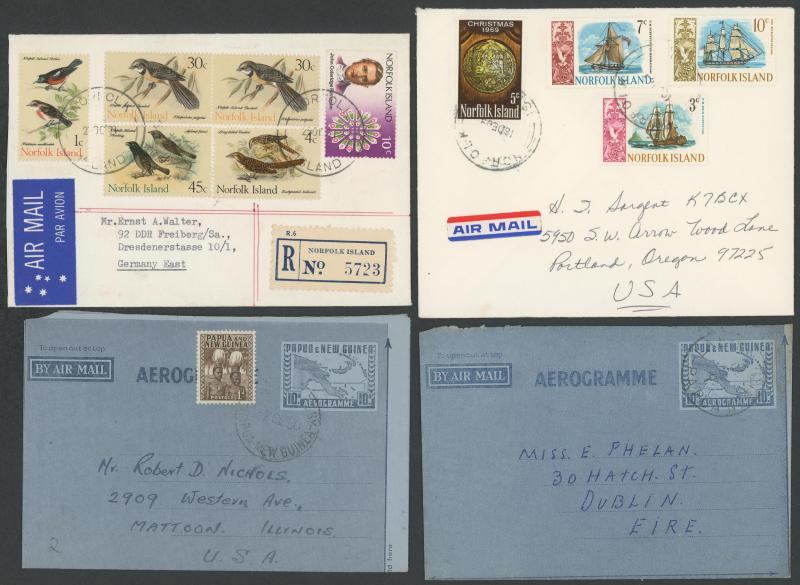 Norfolk Island mostly philatelic covers that have actually been through the mail; Papua New Guinea many PPS Cover Service registereds including with 'RELIEF' cancels, a dozen commercially used aerogrammes, a bundle of South Pacific Post wrappers with