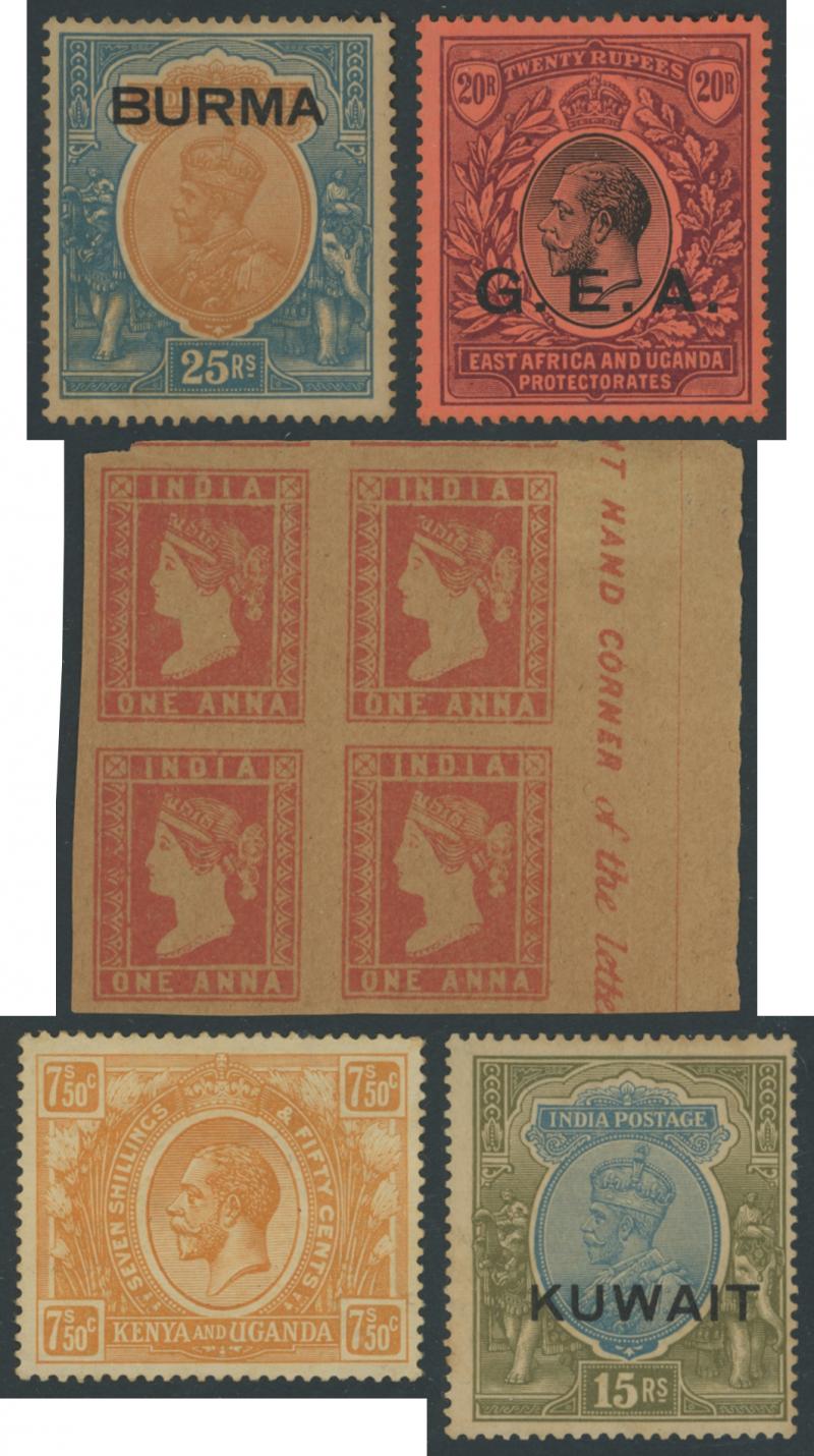 Highly catalogued selection including Burma KGV to 25r, India 1854 1a marginal block of 4 with Papermaker's Watermark on all Units,