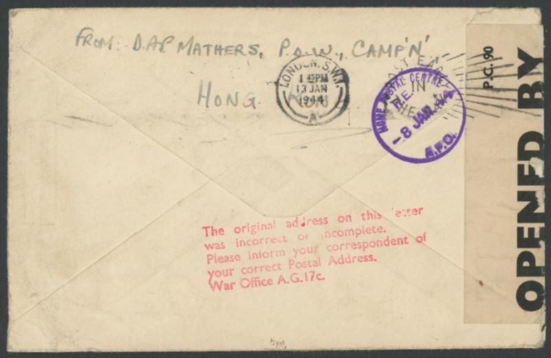 British censor label lifted to reveal superb han in scarlet, the reverse with rubber 'HOME POSTAL CENTRE/ R.E. /8JAN1944/A.P.O.' cds in violet and 5-line 'The original address on this letter/was incorrect or incomplete/.../War Office AG17c' cachet in