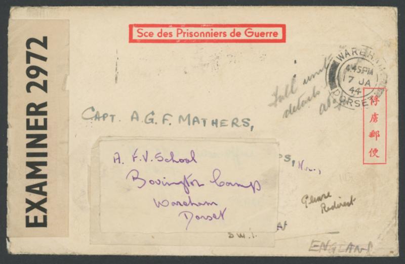 rosine, redirected locally with London machine of 13JAN/1944, and again to "Bovington Camp" with 'WAREHAM/17JA/44/DORSET' arrival cds which obscures pencilled "Full unit/details not provided". (Image1) (Image2)
