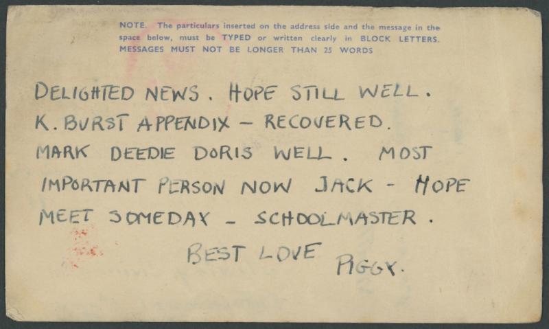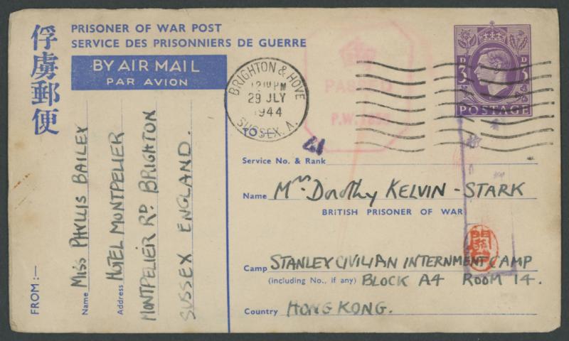 1944 (July 29) Japanese Occupation Stanley Civilian Internment Camp British 3d POW Air Postal Card from Sussex to a British woman