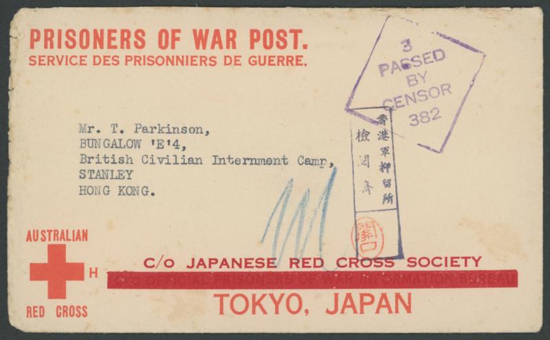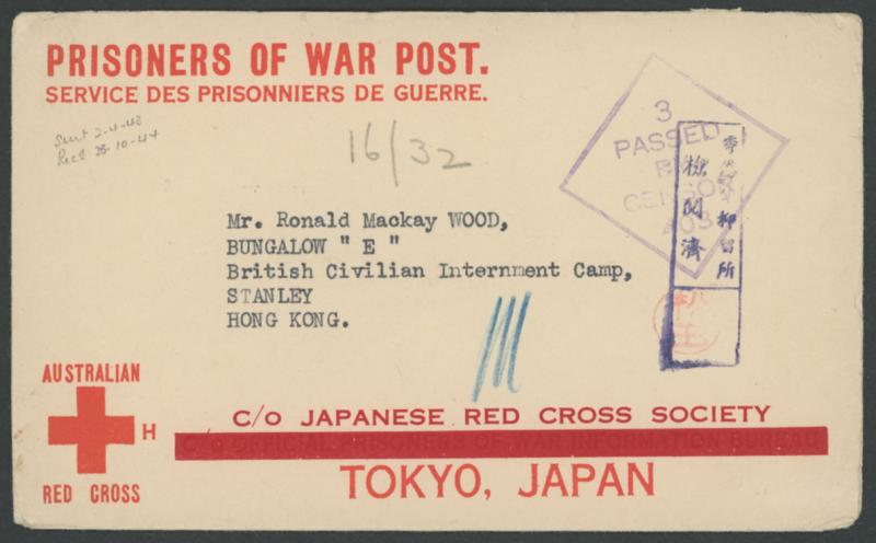 the Base, from Armidale NSW processed through Melbourne as usual, to "Bungalow E/.../Stanley/Hong Kong" with very fine Japanese boxed censor cachet & han of Matsuda (a relieving censor) in scarlet, endorsed at upper-left "Sent 2.4.43/Recd