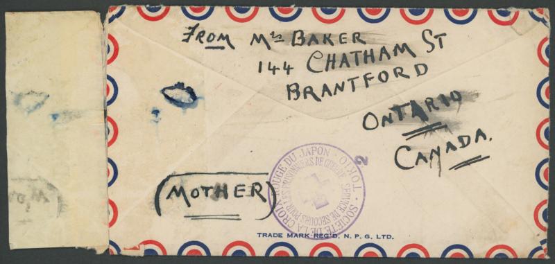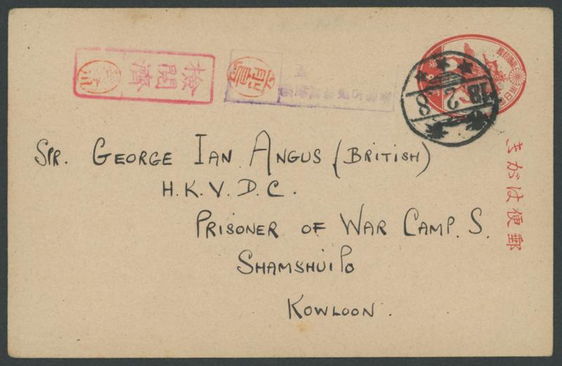 Internee/Prisoner of War/.../Hong Kong/China" with 'POSTAGE FREE/ PRISONER OF WAR MAIL/...' cachet, Canadian & Chinese (damaged) censor labels, Japanese Red Cross roundel in violet on the reverse and superb circular han of Takamatsu in scarlet,