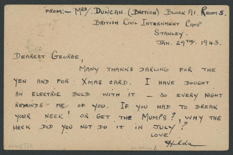 1944 (circa) Japanese Occupation Stanley Civilian Internment Camp Australian Red Cross POW envelope with Thick Obliterating Bar at