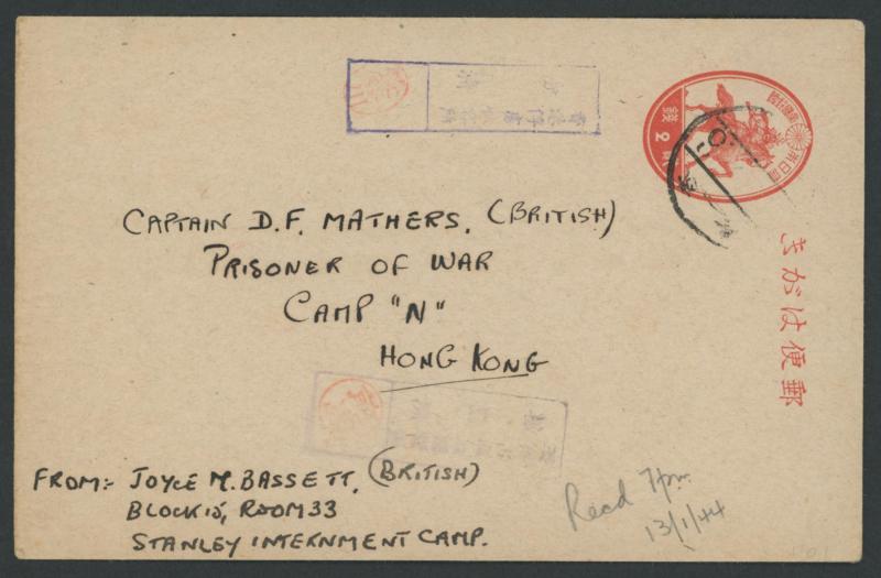 Shamshuipo Camp (Camp S) or Argyle Street Officers Camp (Camp N) with Japanese censor cachets & han of Maejima (very fine) or Hasagawa both in scarlet. The second is endorsed "Recd 13.1.44", showing that even local delivery of POW mail could take up
