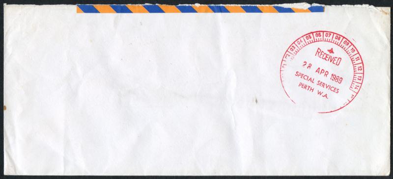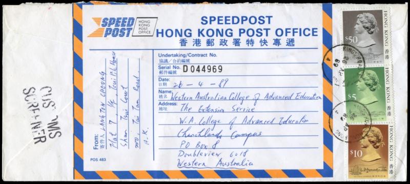 KONG/26AP/89' cds, inspected with 'CUSTOMS/SCREENER' handstamp on the face and 'RECEIVED/28APR1989/SPECIAL SERVICES/PERTH WA' time-clock arrival backstamp in red. (Image1) (Image2)
