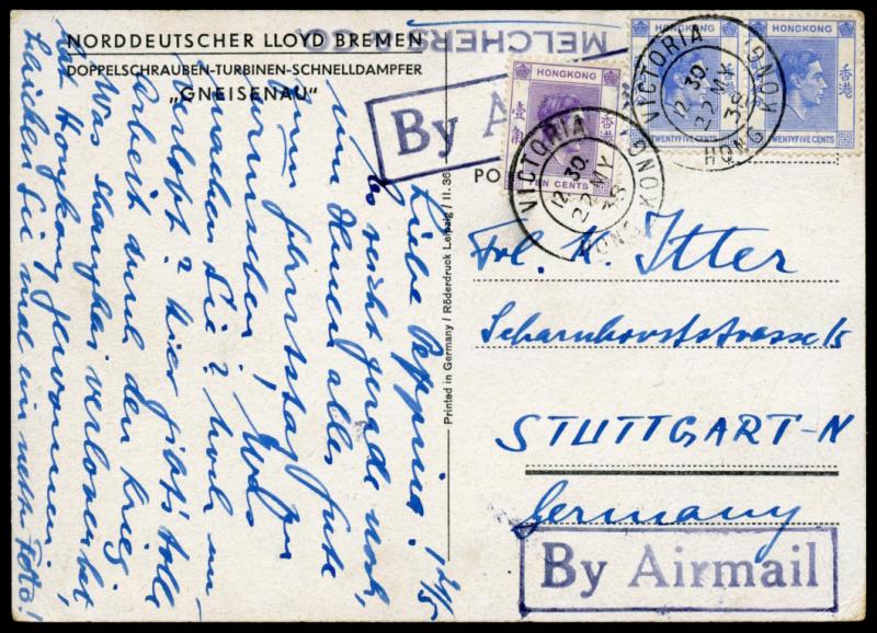 'MELCHERS & CO' cachet, KGVI 10c & 25c pair tied 'VICTORIA/ 22MY/38/HONG KONG' cds, a couple of very minor blemishes. (Image1) (Image2)