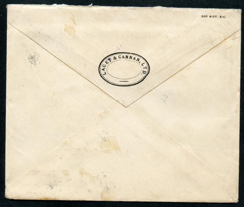 1937 Lacet & Cannan Ltd merchant envelope with Ellerman logo on face airmail to England with violet 'VIA IMPERIAL ARIWAYS' cachet