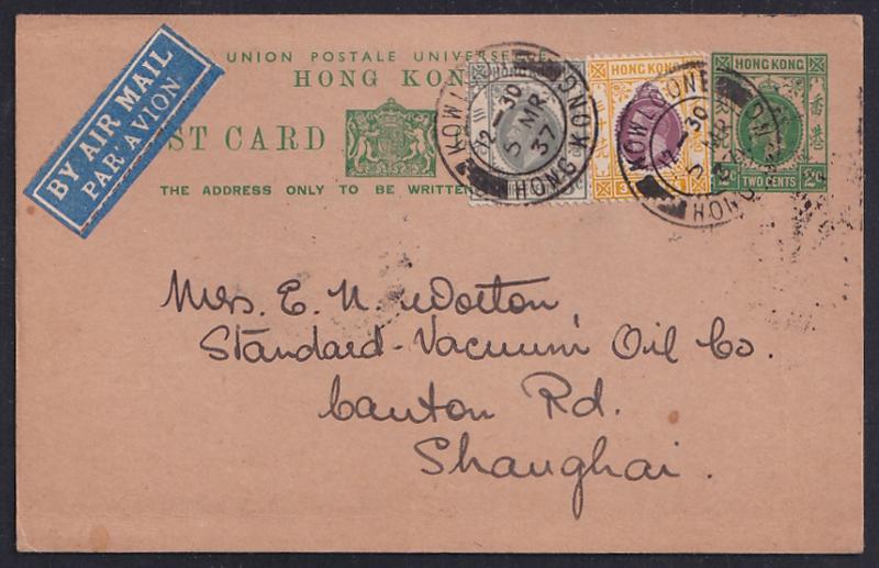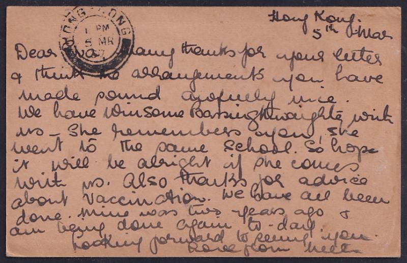 vaccination we have all been done", airmail to Shanghai, China with KGV 3c grey and 30c purple & orange added tied by 'KOWLOON' cds, 'HONG KONG' transit backstamp of 30 minutes later. The rate was 35c airmail postcard for carriage by China National