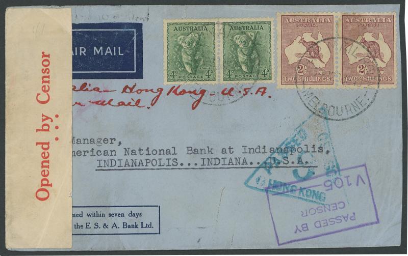 Kangaroos 2/- maroon pair tied by Melbourne cds, censored locally and at Hong Kong (backstamp of 10JY/40), a few minor blemishes. From mid-1940, this service operated concurrently with the less expensive PanAm FAM-19 San Francisco-Auckland at 4/- per