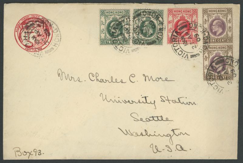 EXPOSITION/SEATTLE 1909' illustrated advertising on the face, to USA with KEVII Keyplates 1c x2, 2c x2 & 4c tied by 'VICTORIA/HONG KONG' cds, a couple of minor blemishes. The foreign letter rate was 10c per ½oz. (Image1) (Image2)