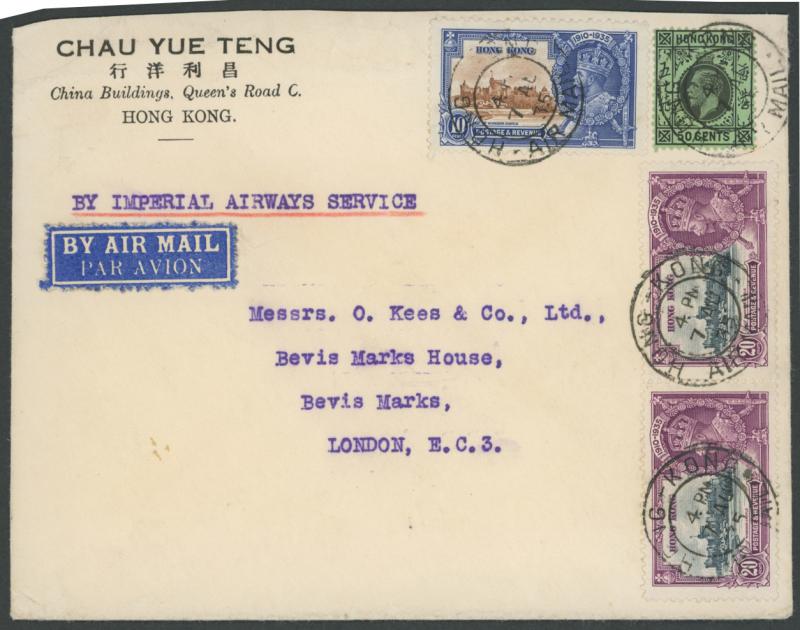 1935 (Aug 7) Chau Yue Teng, China Buildings, Queen's Road envelope airmail to London with KGV Silver Jubilee 10c & 20c x2 plus KGV