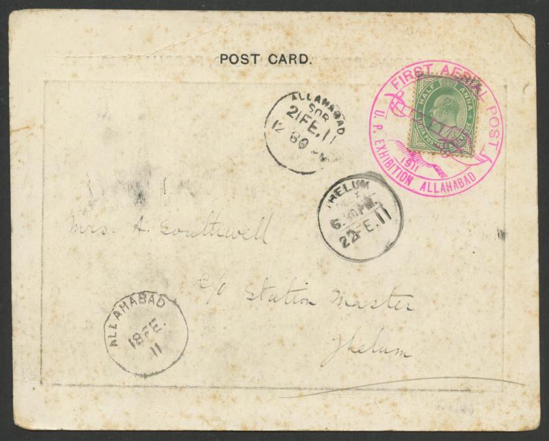 tied by very fine strike of the 'FIRST AERIAL POST/[biplane]/1911/U.P. EXHIBITION ALLAHABAD' cds in rosine, 'ALLAHABAD' & 'JHELUM' arrival cds, small corner crease & light tonespots. Very scarce: stated only 40 were signed. (Image1) (Image2)