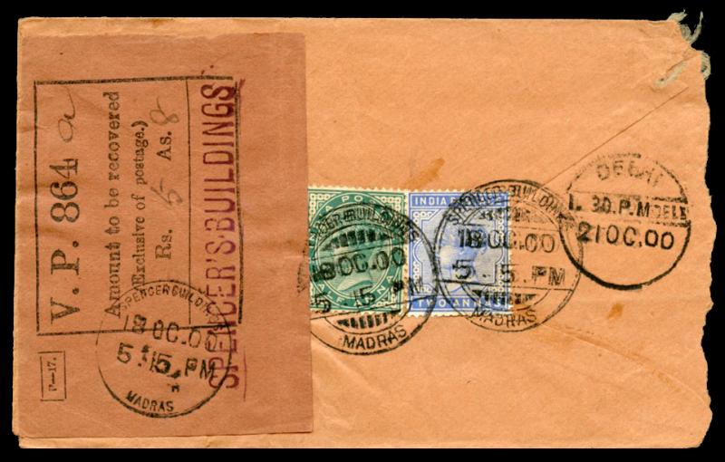2a affixed on back tied 'SPENCER BUILDINGS/MADRAS' cds with 'V.P. 864/Amount to be recovered/(Exclusive of postage)/Rs ("5") As ("8")' Cash On Delivery label alongside, a little roughly opened at left. (Image1) (Image2)