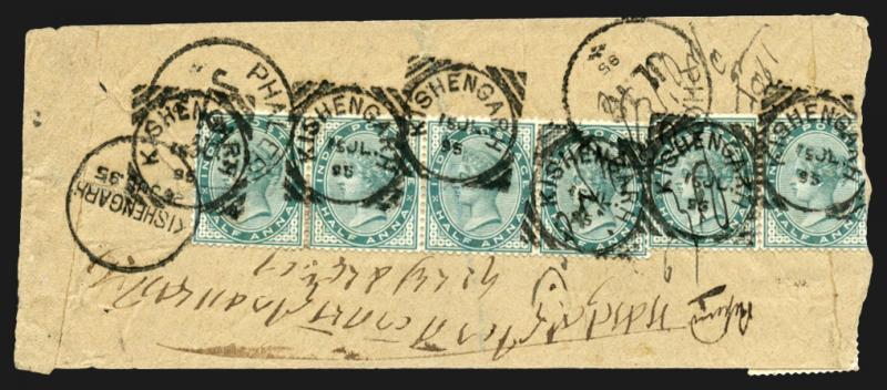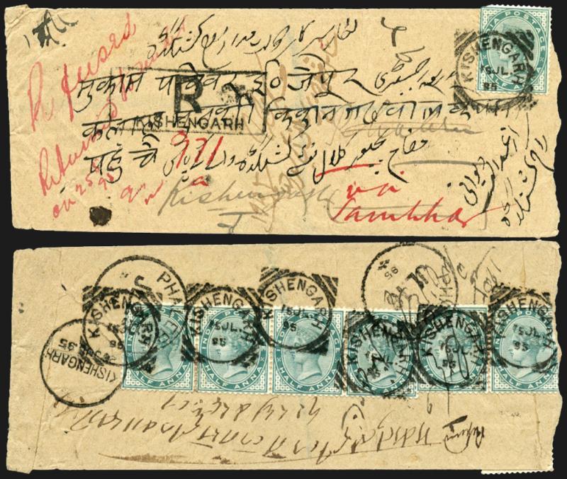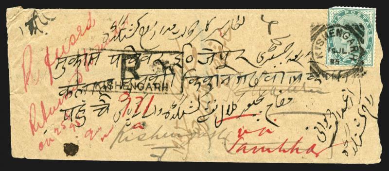 superb strikes of 'KISHENGARH/15JL/95' Squared Circle d/s, boxed 'R / KISHENGARH' cachet on face, 'PHALERA' arrival backstamp but then endorsed "Refused/Returned to Sender" in red ink on face, minor faults. Kishangarh did not commence issuing its own