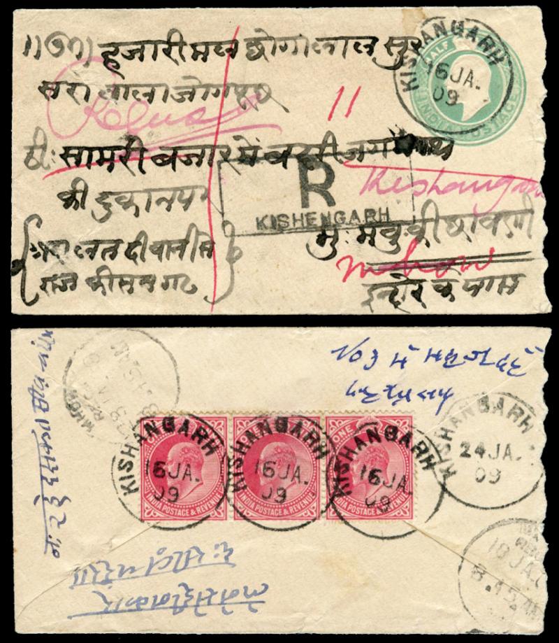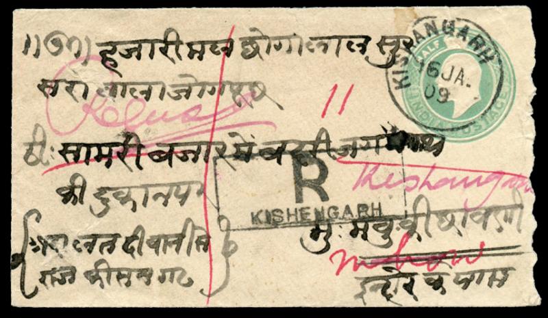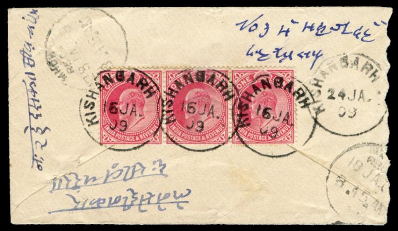 cds, boxed 'R / KISHENGARH' cachet on face (note different spelling), 'MHOW/REC'D/23JA09' arrival b/s, a little roughly opened at right. [Kishangarh issued its own stamps from 1899, but these were valid for internal mail only] (Image1) (Image2)