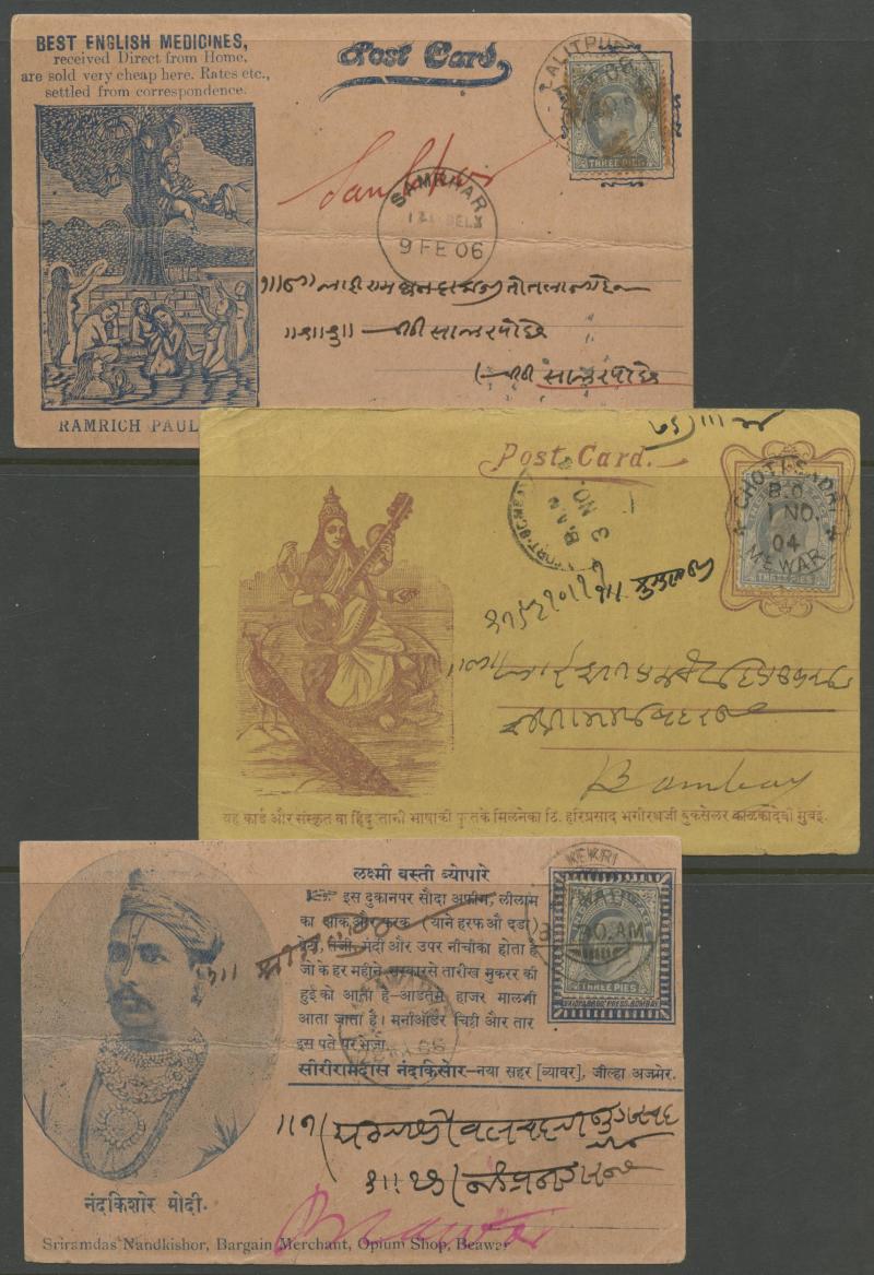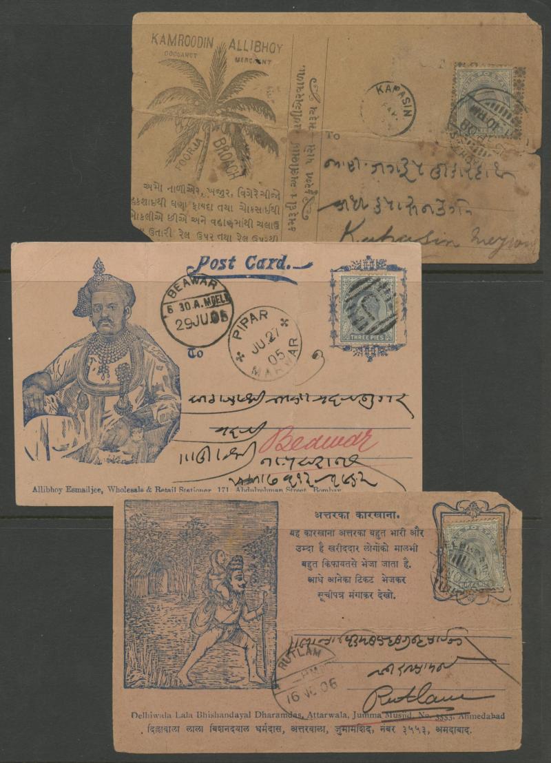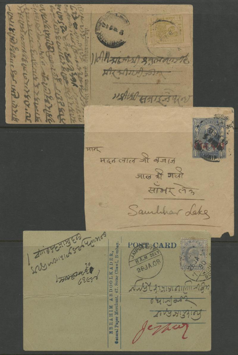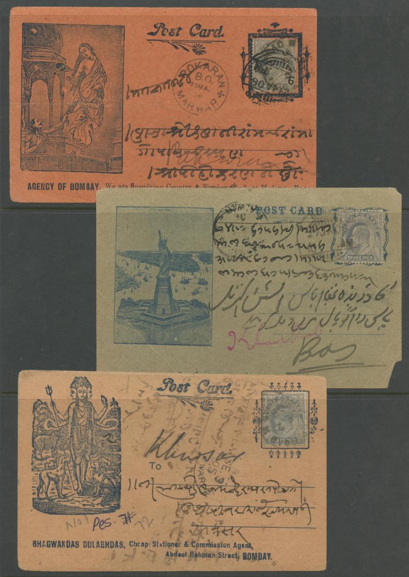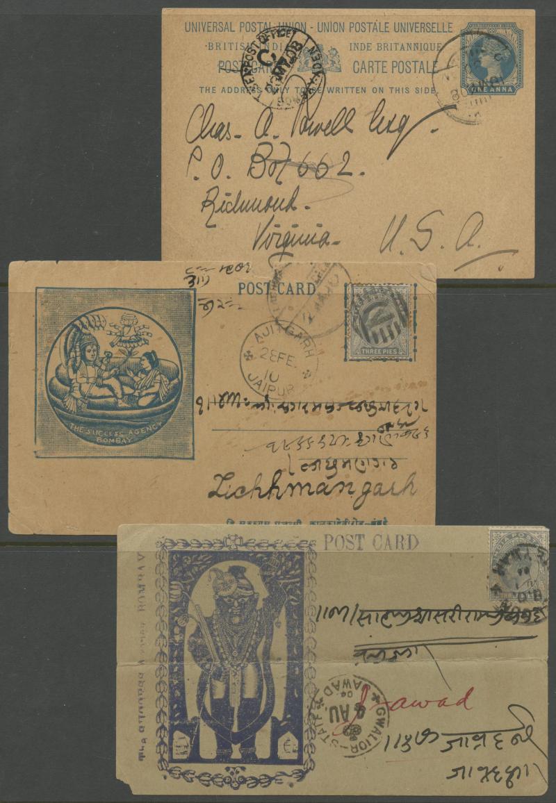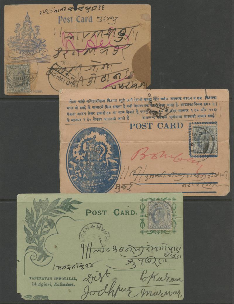 most with 'stamp collars' and KEVII 3p grey for local use, variety of firms noted 'Bargain Merchant Opium Shop', potential postmark interest, also Postal Card QV 1a blue to USA with 'SEA POST OFFICE/C/BOMBAY-ADEN' cds, plus Jaipur 1913 postcard with