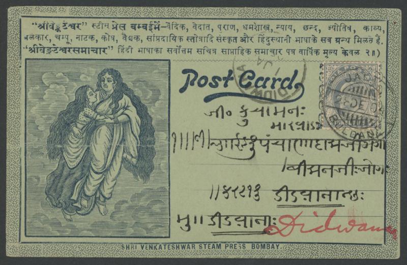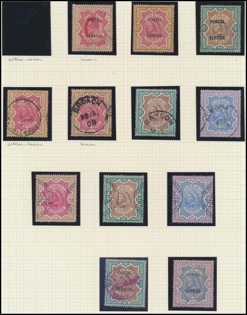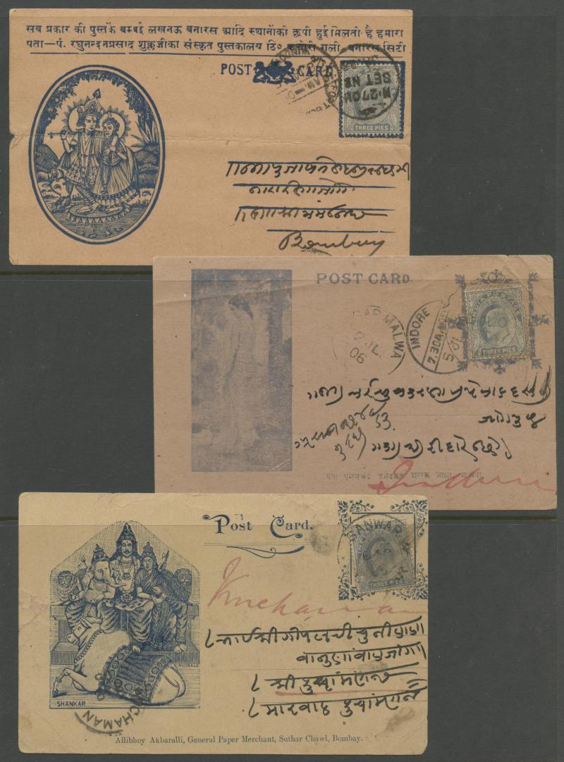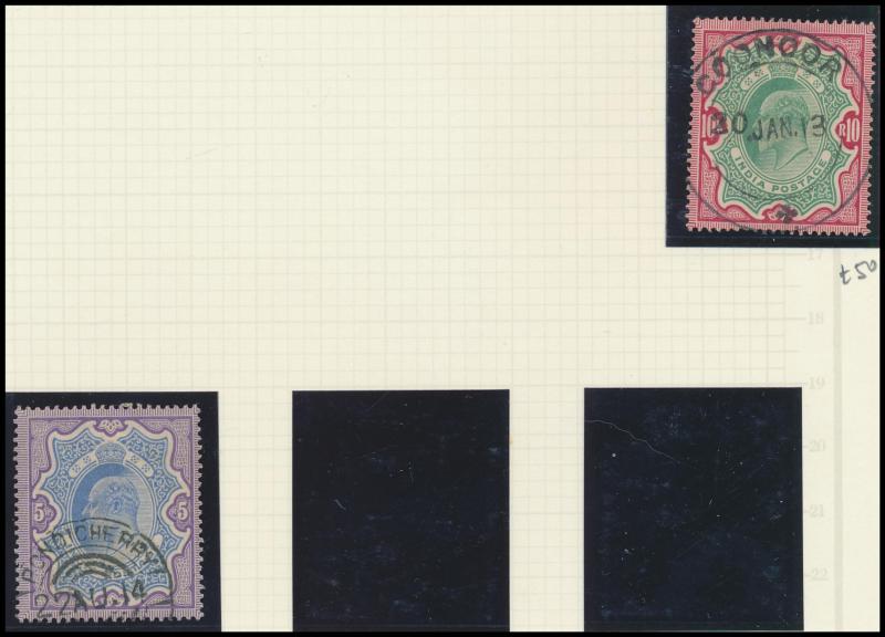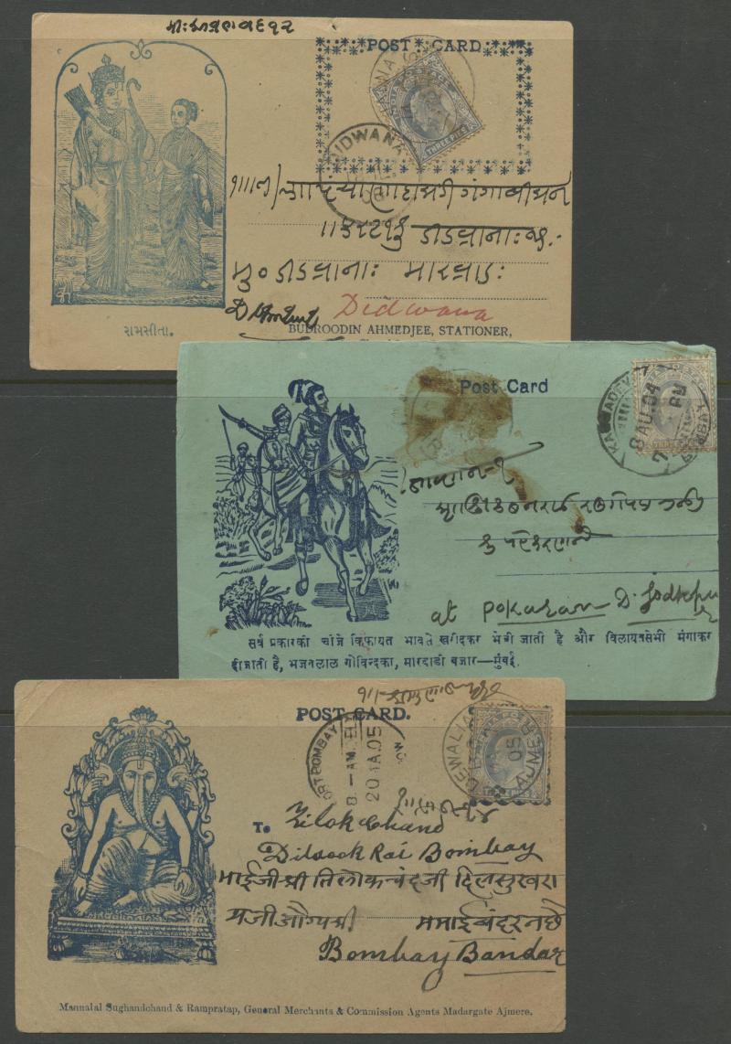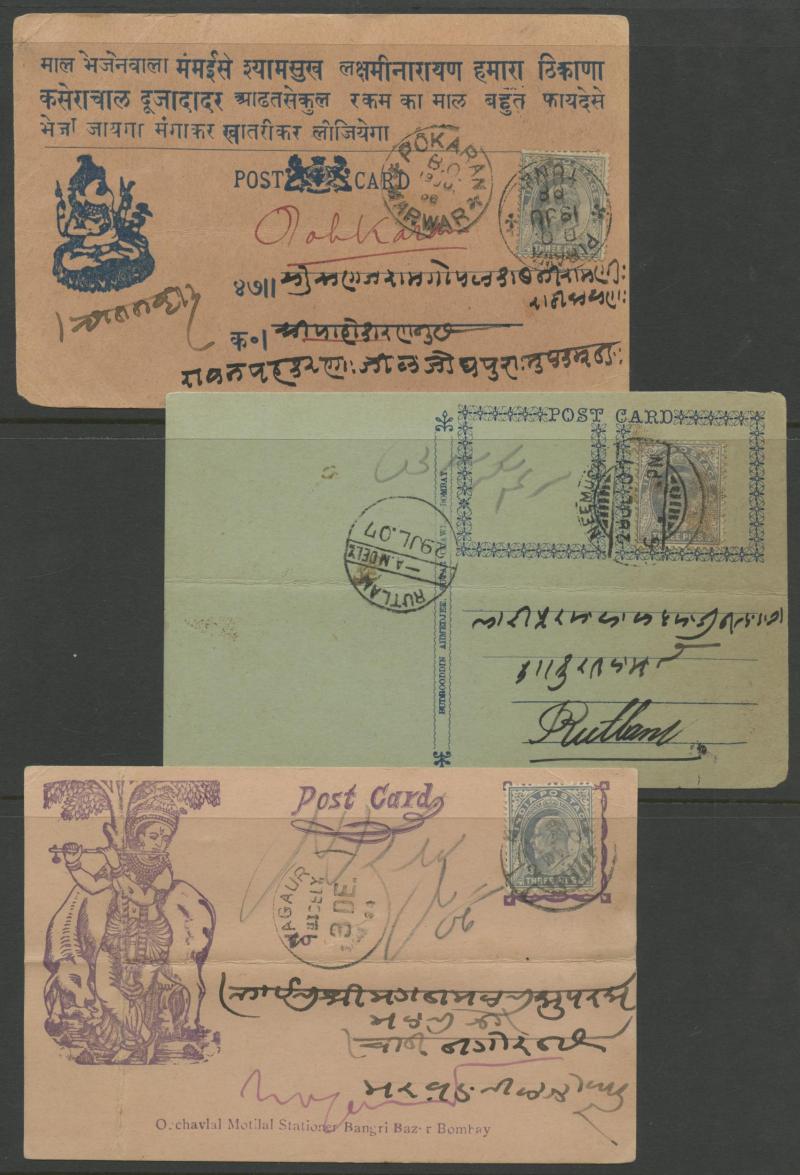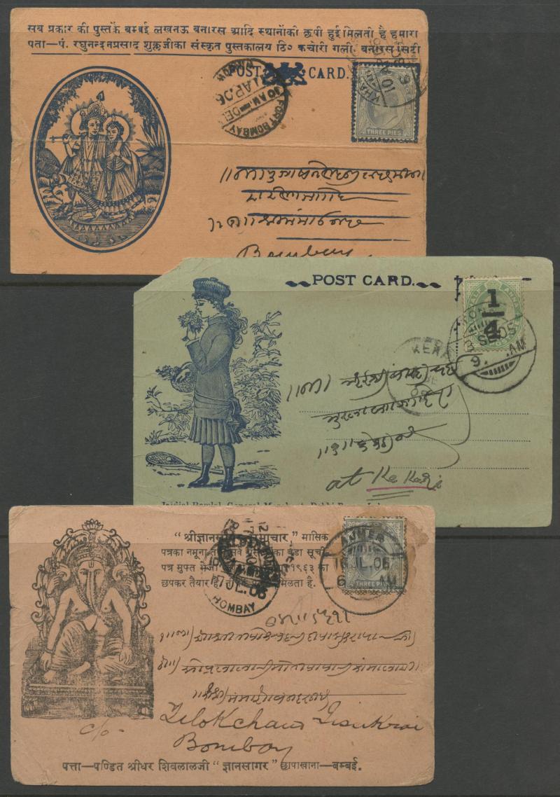 most with 'stamp collars' and KEVII 3p grey for local use, variety of firms noted 'Bargain Merchant Opium Shop', potential postmark interest, also Postal Card QV 1a blue to USA with 'SEA POST OFFICE/C/BOMBAY-ADEN' cds, plus Jaipur 1913 postcard with