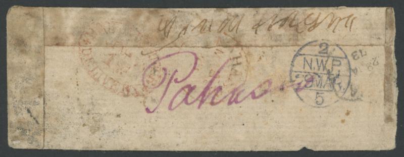 carried by train with very fine North West Provinces Travelling Post Office '2/N.W.P.' upright-oval transit (Renouf type 129) on reverse alongside '.../DELIVERY' arrival in red, a few minor faults. (Image1) (Image2)