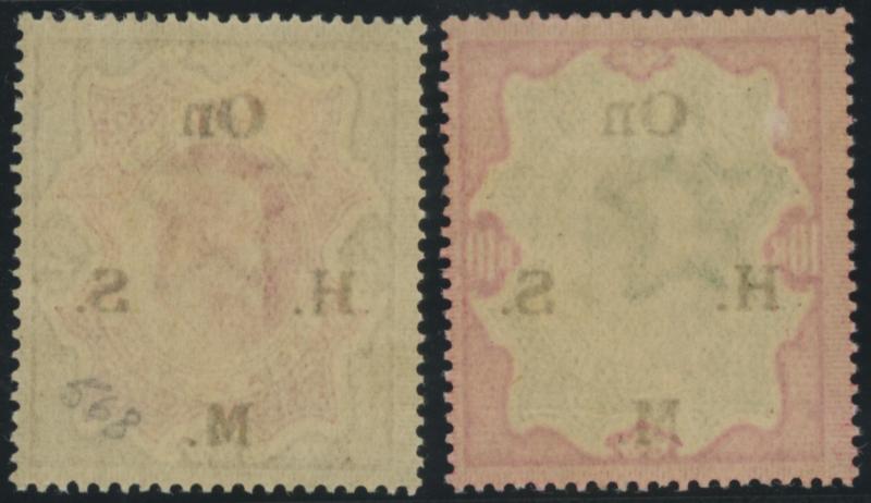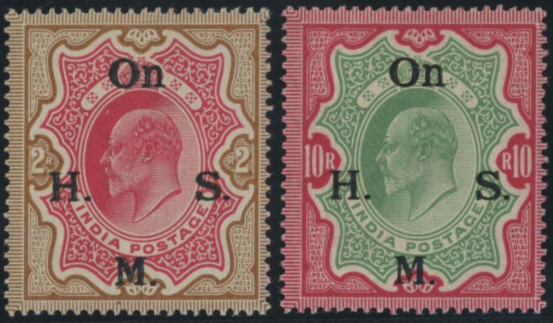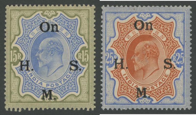 OFFICIAL STAMPS: 1909 KEVII Definitives 'On H.M.S.' overprints 2r carmine & yellow-brown, 10r green & carmine, 15r blue &
