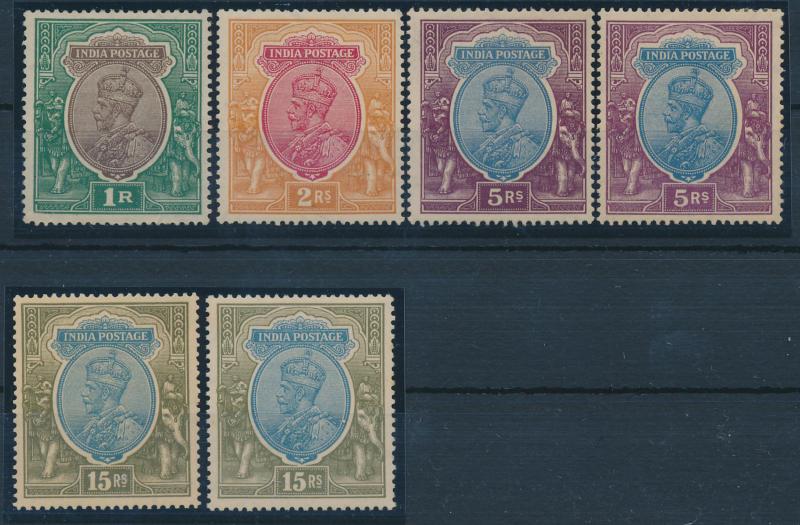 1911-23 KGV Definitives Single Star Watermark 1r brown & green, 5r ultramarine & violet, 10r green & scarlet, 15r blue & olive, and