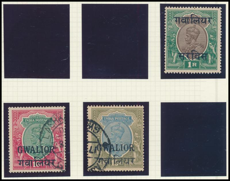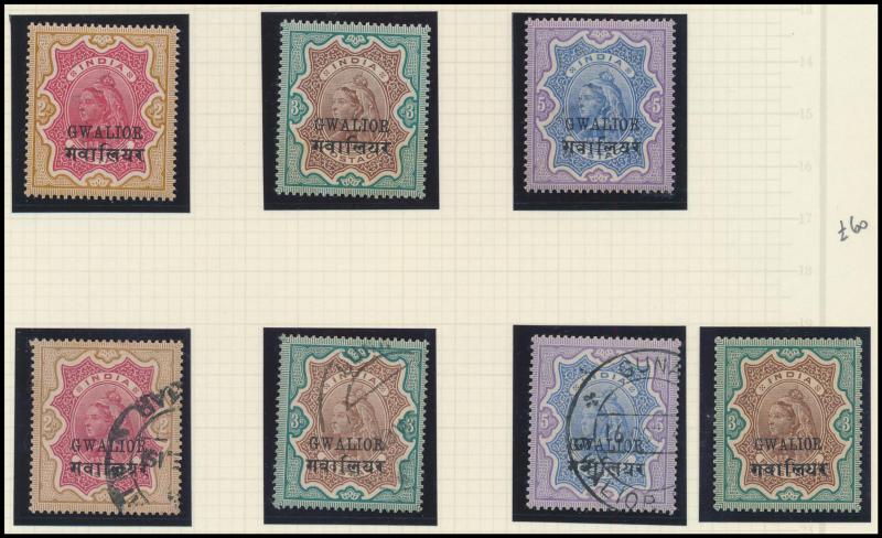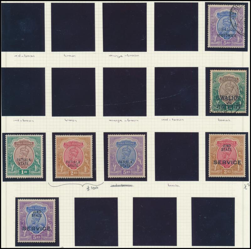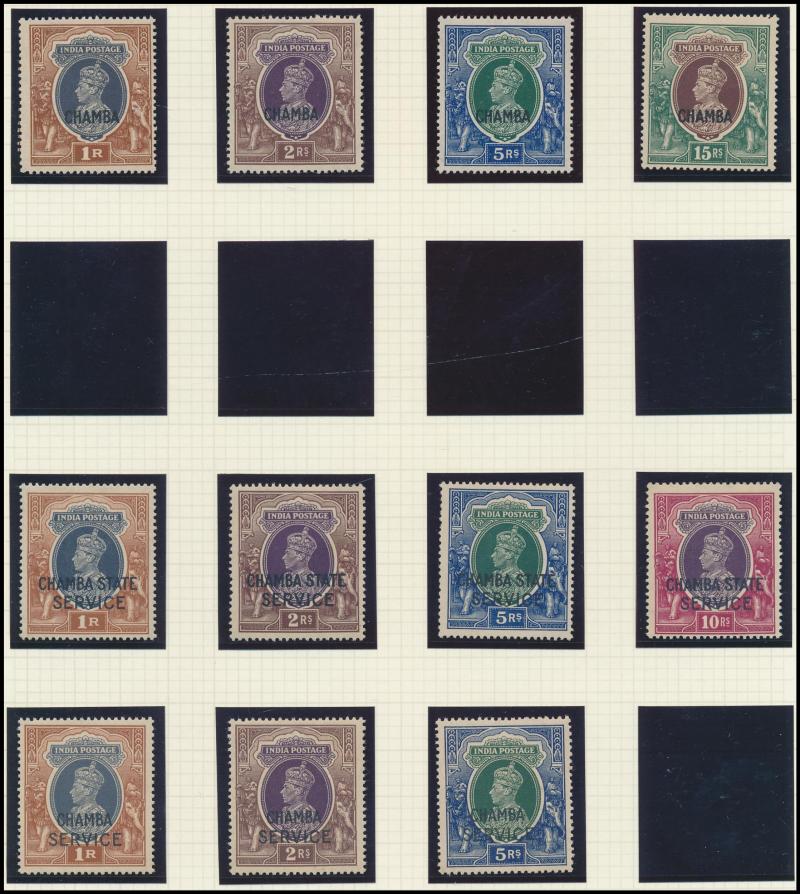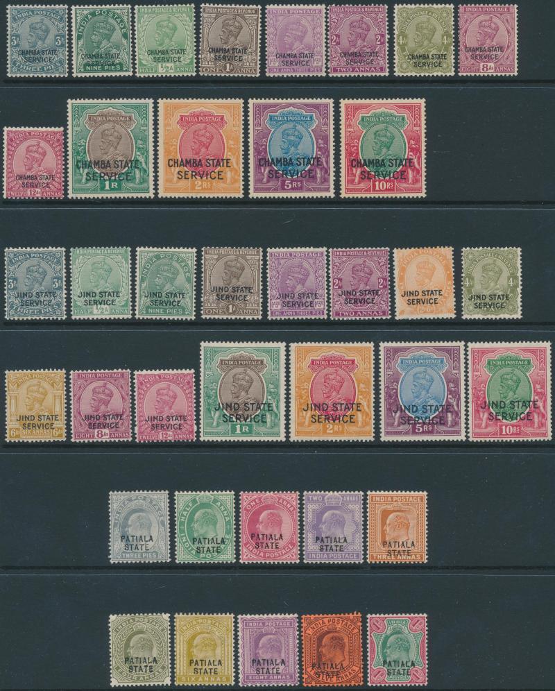 Convention States overprints including 'CHAMBA' KGVI 1r to 10r, 'CHAMBA STATE/SERVICE' KGV Nasik Printing set & KGVI 1r to 10r, 'CHAMBA/SERVICE' KGVI 1r to 5r **, 'FARIKDOT/STATE' QV 12a purple/red & 1r slate, 'GWALIOR' KGV Nasik Printing 10r & 15r