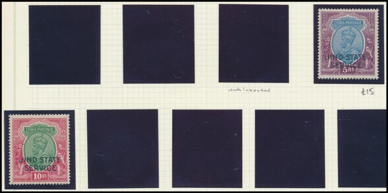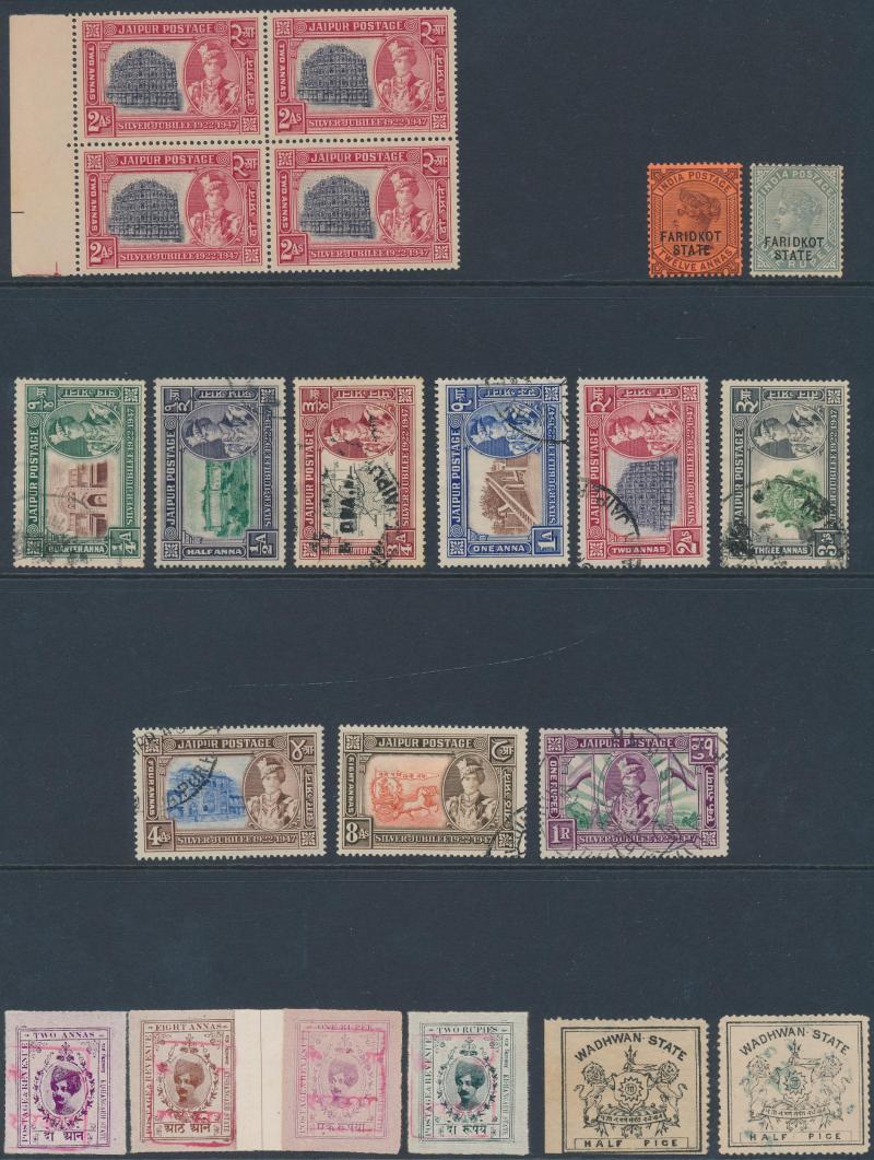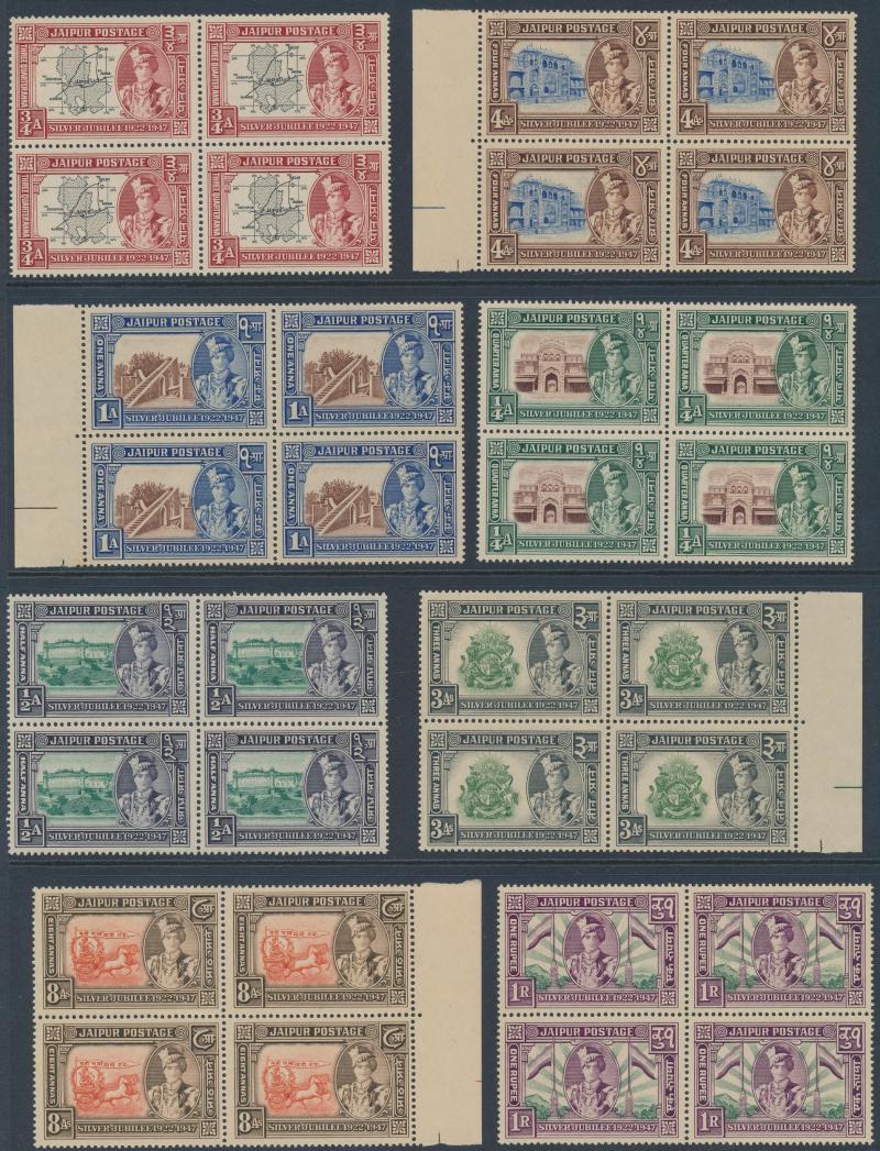 used, 'JIND' KGVI 1r to 15r * plus 25r **, 'JIND STATE/SERVICE' KGV Nasik Printing set, 'JIND/SERVICE' KGVI 1r to 10r * (the 5r **), 'PATIALA/STATE' KEVII 3p to 1r set & KGV 1r to 5r, Feudatory States Jaipur 1948 Silver Jubilee set in blocks of 4 **