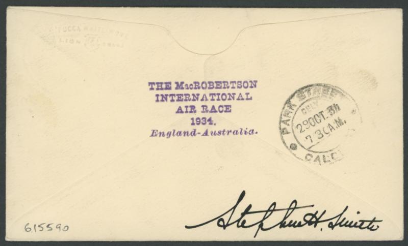 STREET/CALCUTTA' backstamp and KGV 9p green tied by 'MINGALADON CANTONMENT' cds on arrival, large black/green label tied by very fine 'THE MacROBERTSON/ INTERNATIONAL/AIR RACE/1934/England-Australia' cachet, signed by "NC McGregor, Pilot" at