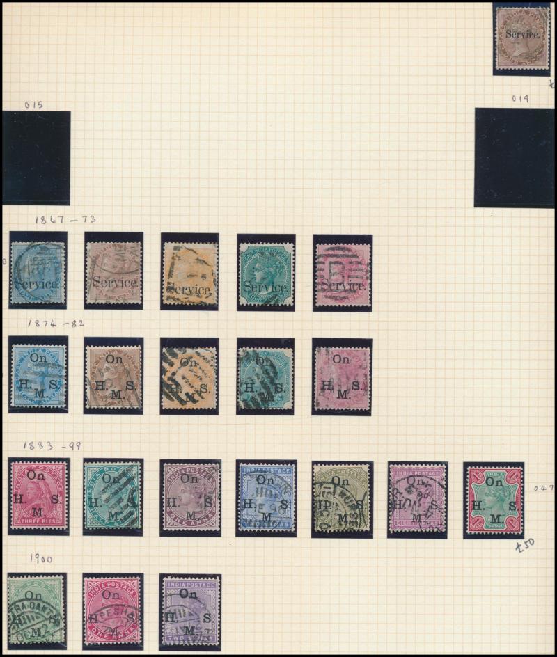 Fiscals 6a violet and 'SERVICE POSTAGE' ½a mauve, 1866-78 2a8p slate unused, 1874 9p mauve & 1r slate, 1876 12a Venetian red, then mostly mint including 1882-90 4a6p green block of 8 (4x2) ** and 1r green & red Official overprint *, 1895 2r, 3r