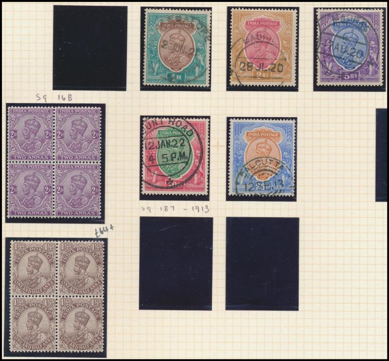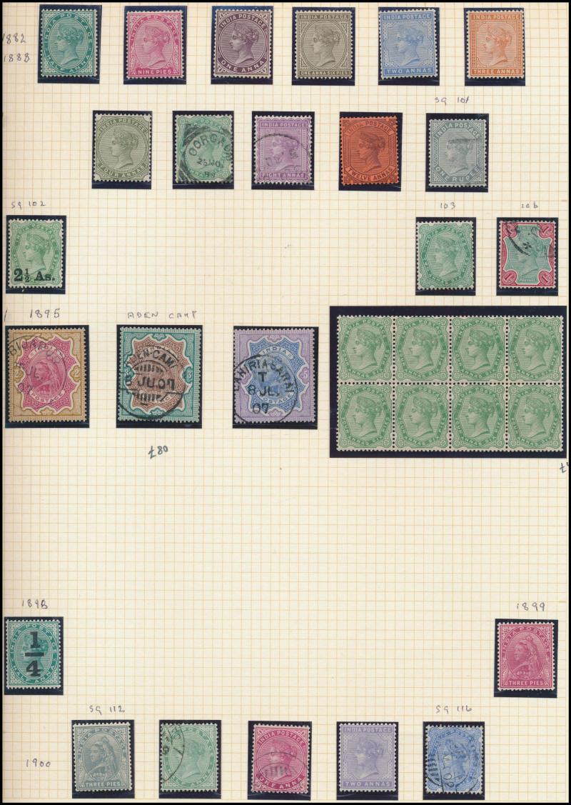 ('ADEN CAMP' cds cancel) & 5r used, 1902-11 KEVII 4a olive & 1r green & aniline scarlet blocks of 4 ** plus Official overprints set, 1911-22 KGV 2a mauve block of 4 ** & 25r with telegraph cancel and 1932-36 set (ex 6a) **, 1929 Airs, 1931 New Delhi