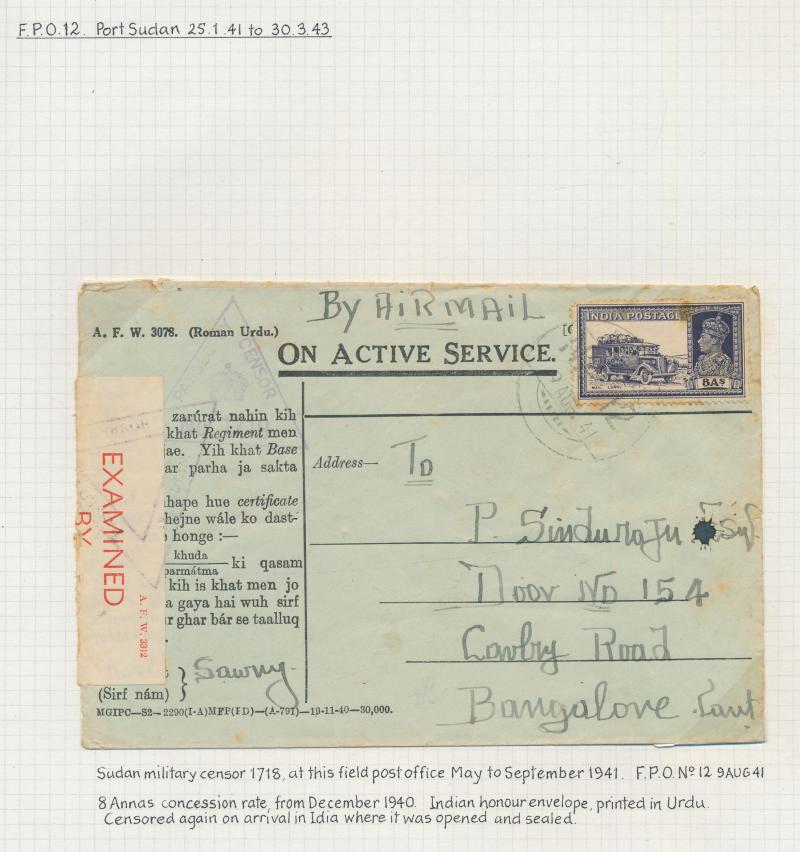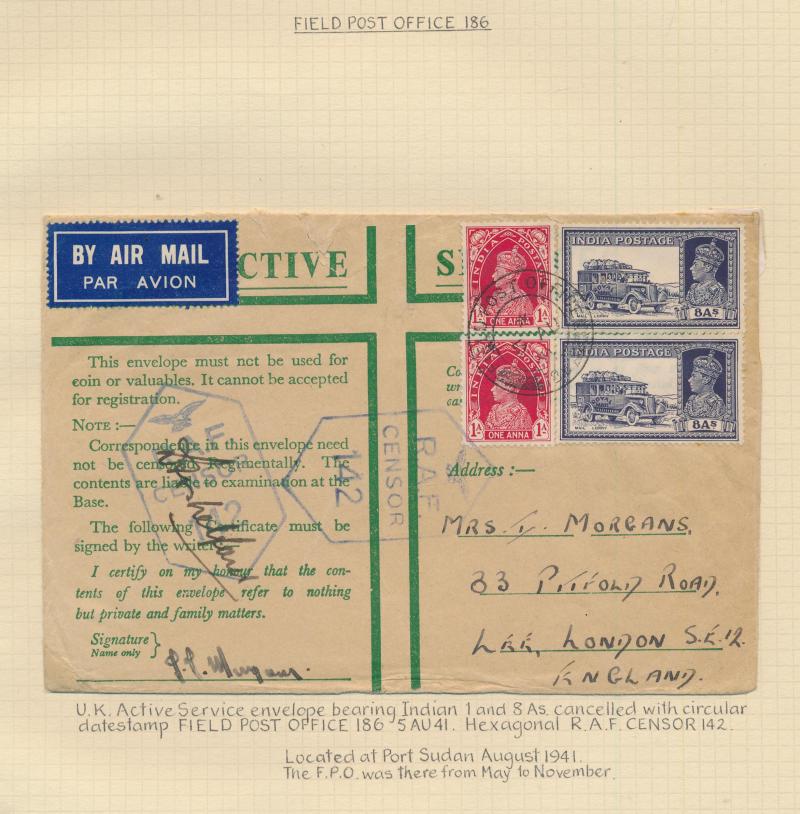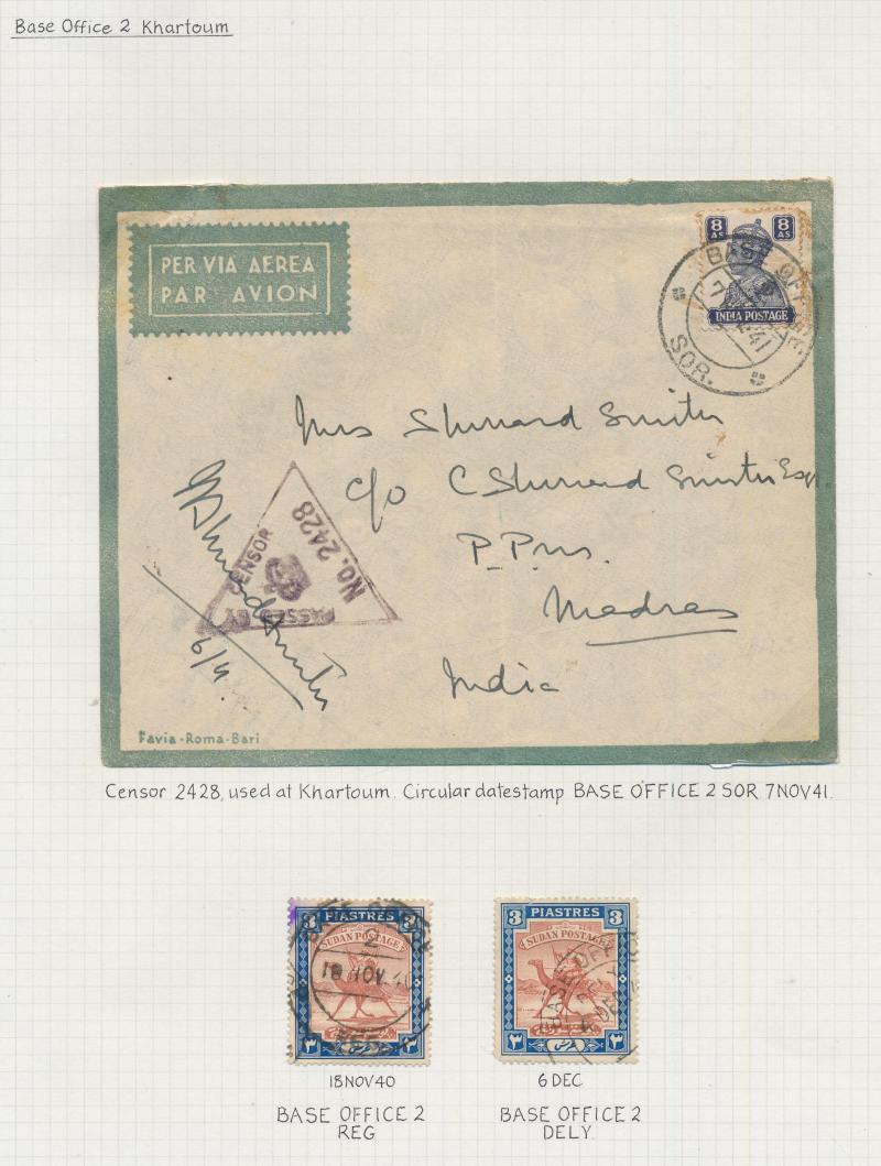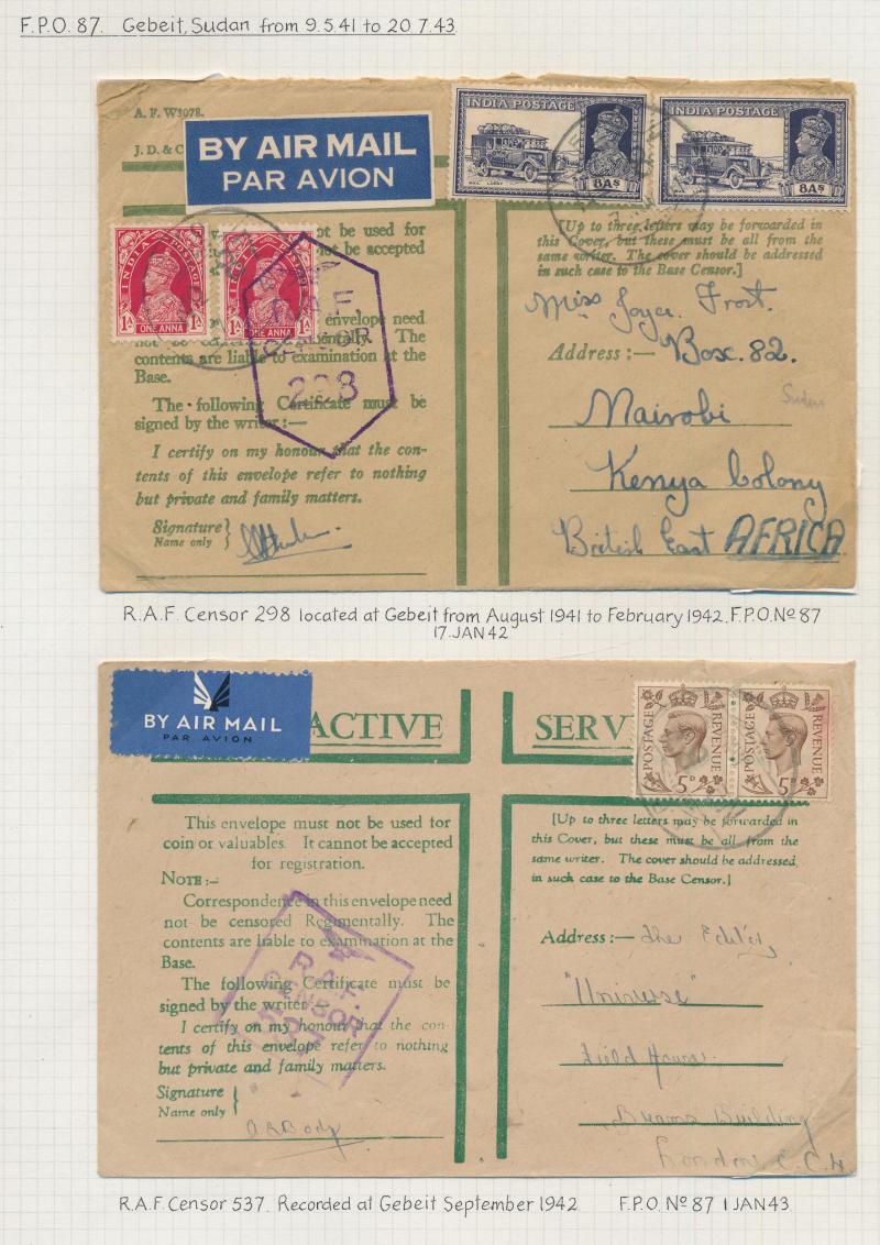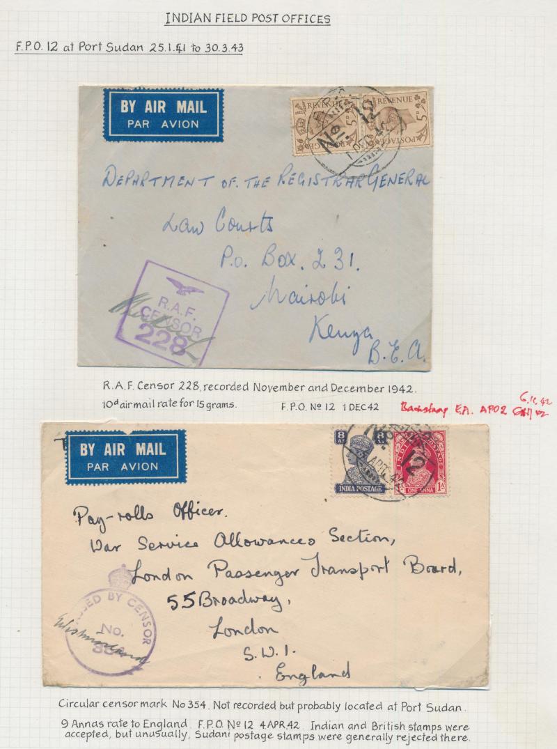 "privilege" envelopes, two with rubber 'IND PO No 104' cds (illustrated by Proud at Volume 3 p401) used at Port Sudan, 'FPO/---S285' recorded by Ted Proud as used at a British FPO x2 (one registered also with "FPO S285" on the R label), censor