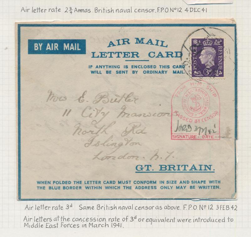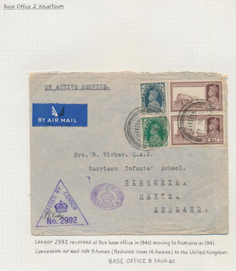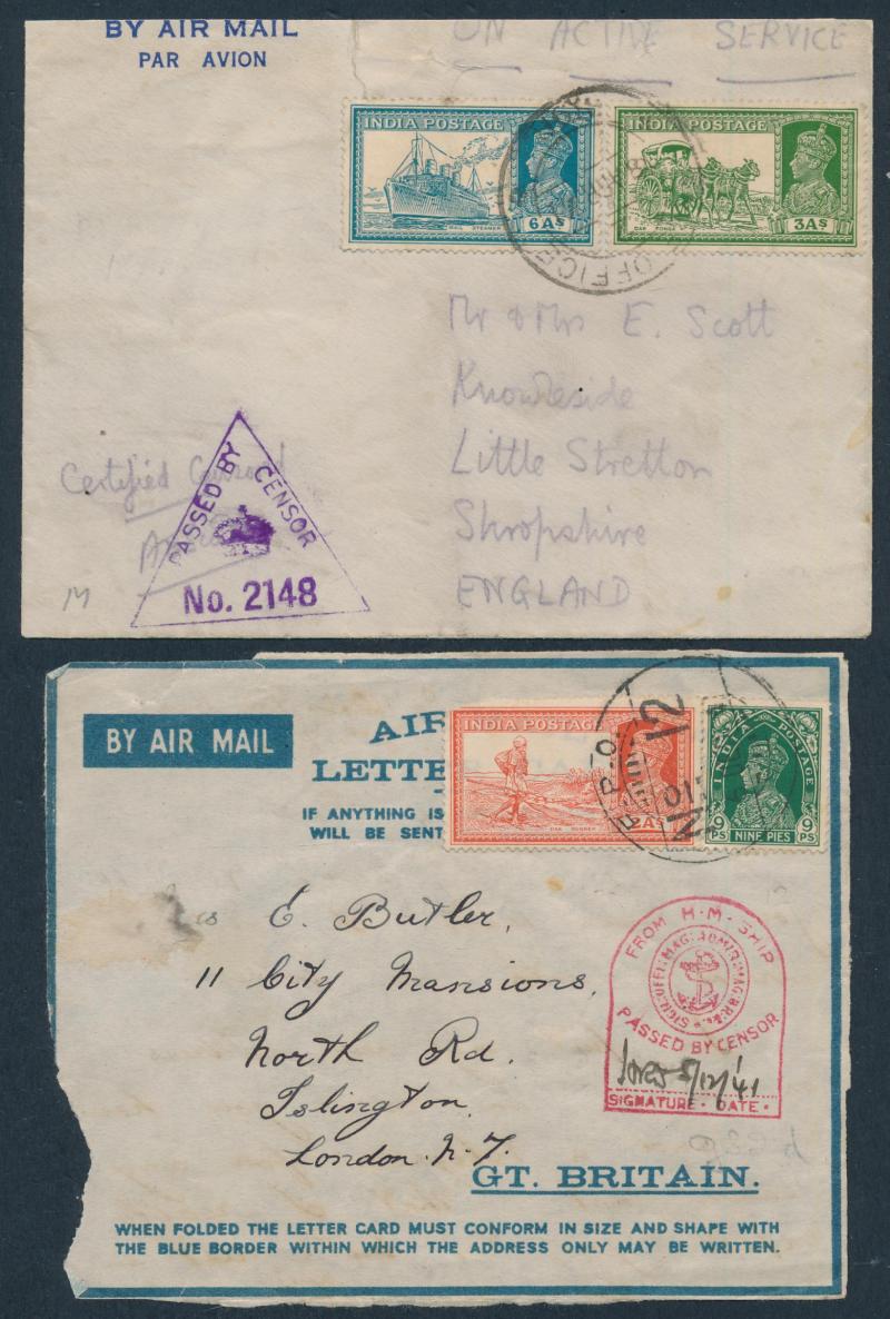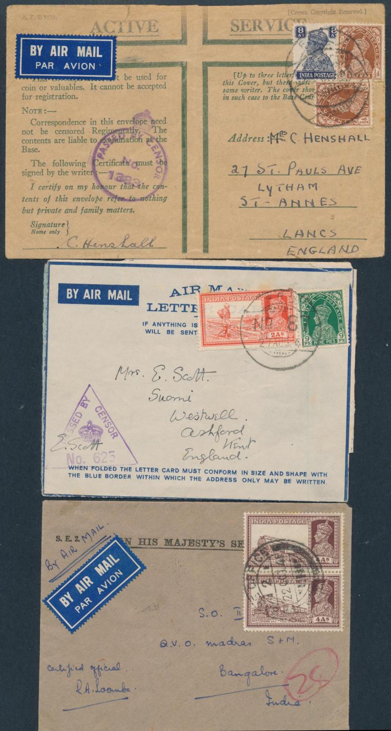 "privilege" envelopes, two with rubber 'IND PO No 104' cds (illustrated by Proud at Volume 3 p401) used at Port Sudan, 'FPO/---S285' recorded by Ted Proud as used at a British FPO x2 (one registered also with "FPO S285" on the R label), censor